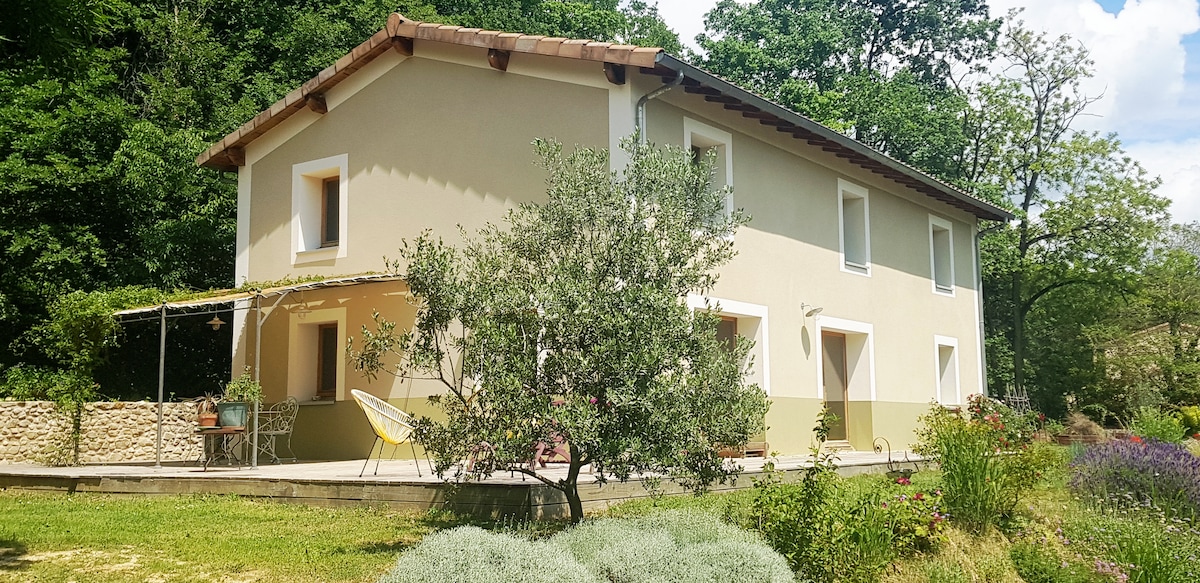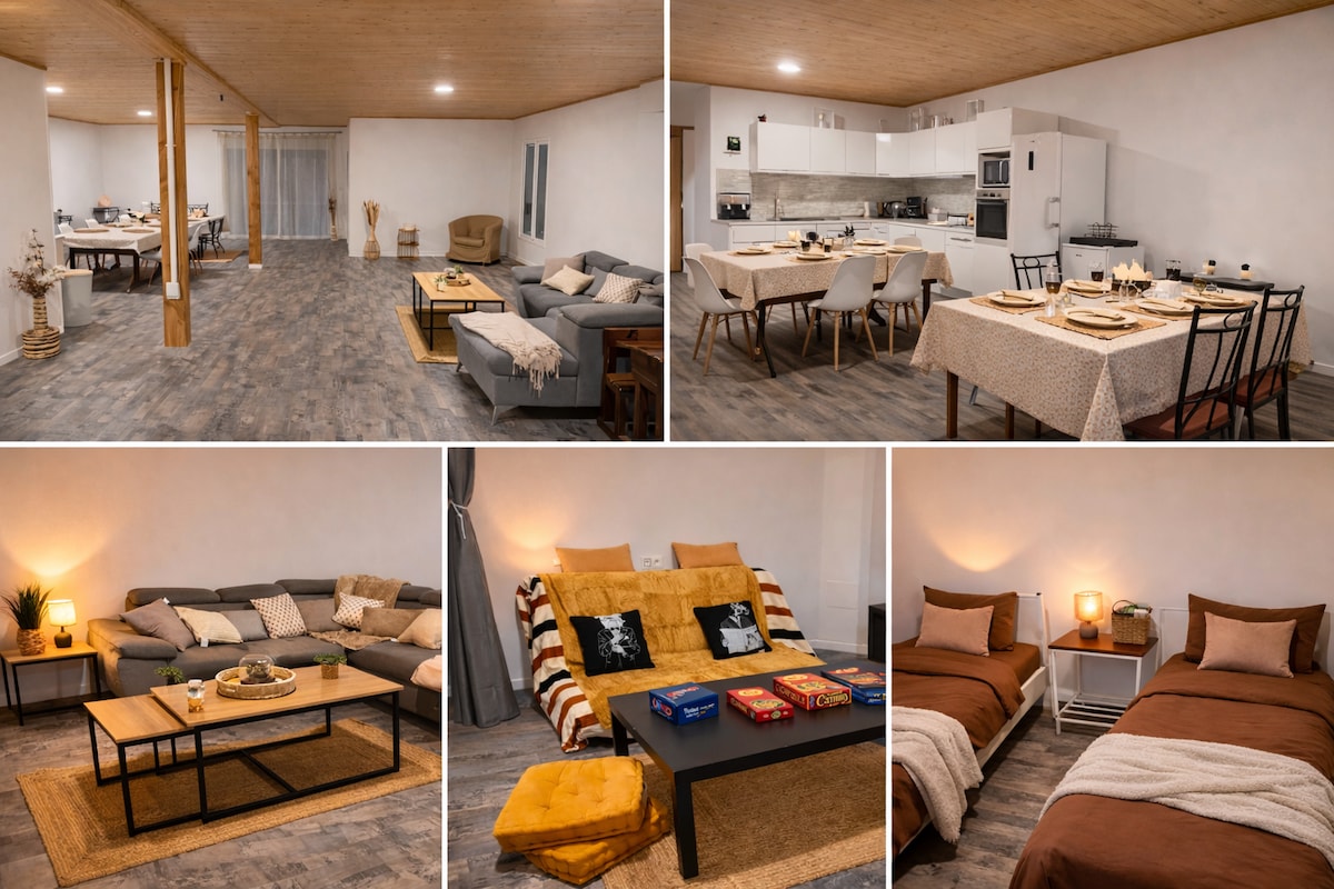 Si vous aimez la nature et les animaux, venez vivre une expérience unique chez nous. Notre domaine est idéal pour un séjour en famille ou entre amis, avec sa salle de 100 m² pour vos moments de convivialité, sa salle de cinéma et sa piscine. Les amateurs de randonnées seront comblés. Entourée de verdure et de forêts, notre maison accueille des familles avec leurs animaux. Ce choix, qui nous tient à cœur, peut laisser des traces malgré notre ménage rigoureux: Cela fait partie du charme du lieu.