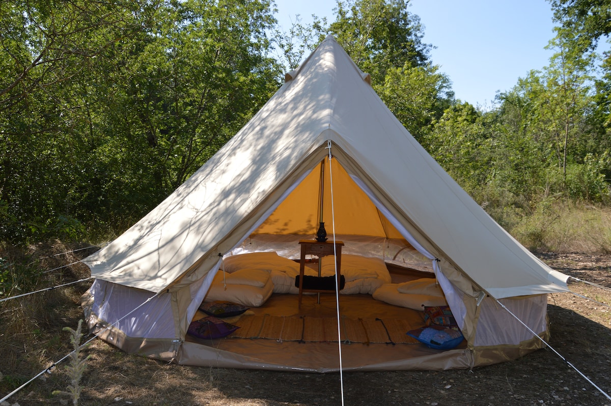 MICA, tente équipée tout confort 12 m² pur coton, rivière à 5 min à pied. Un lieu hors du temps. Sur le même lieu LA COLLINE VAGABONDE : 1 autre tente, une cabane sur pilotis, 1 maison indépendante. La tente, installée à flanc de colline entre pins et châtaigniers. Belle rivière à 5 minutes de marche. Ici nous vivons simplement et en harmonie avec la nature, nous aimons aussi confort et propreté. Cuisine équipée partagée, eau courante et chaude Salle d'eau et WC sec partagés par 2 couples max.