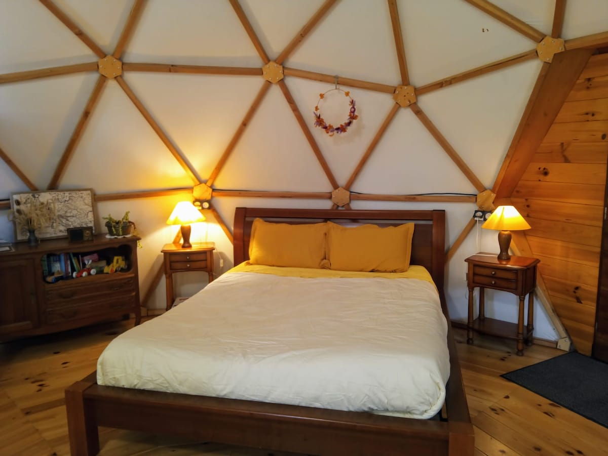 Pour se dé-confiner, il n’y a rien de mieux que le confort en pleine nature. Un vrai hébergement insolite et tranquille . Vous logerez dans un dôme géodésique construit en bois avec 1 grand lit double, une petite salle de bain et wc. Un petit nid romantique avec vue sur les etoiles. un petit apéro de bienvenue vous attend. Le prix est dégressif dès la deuxième nuit.