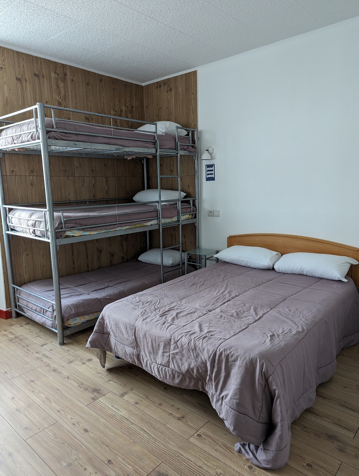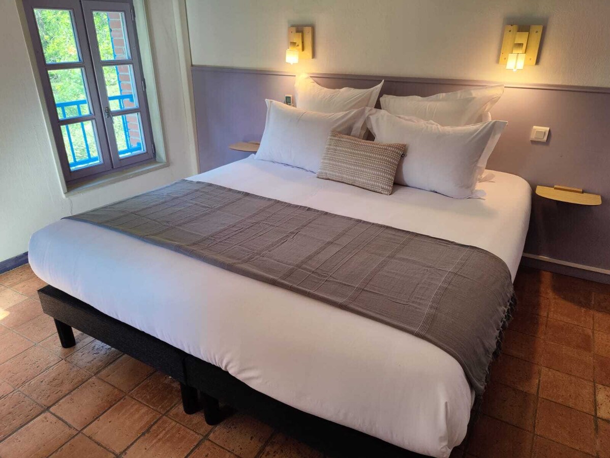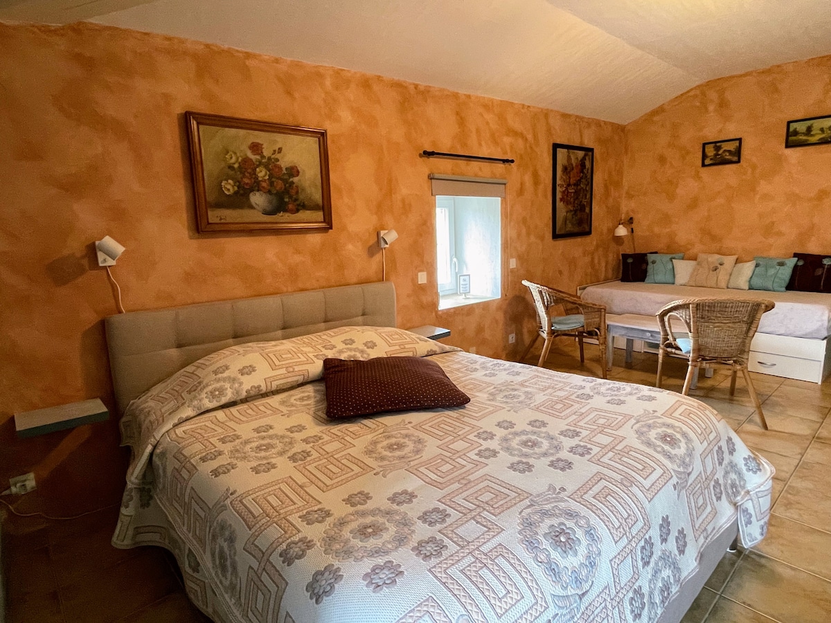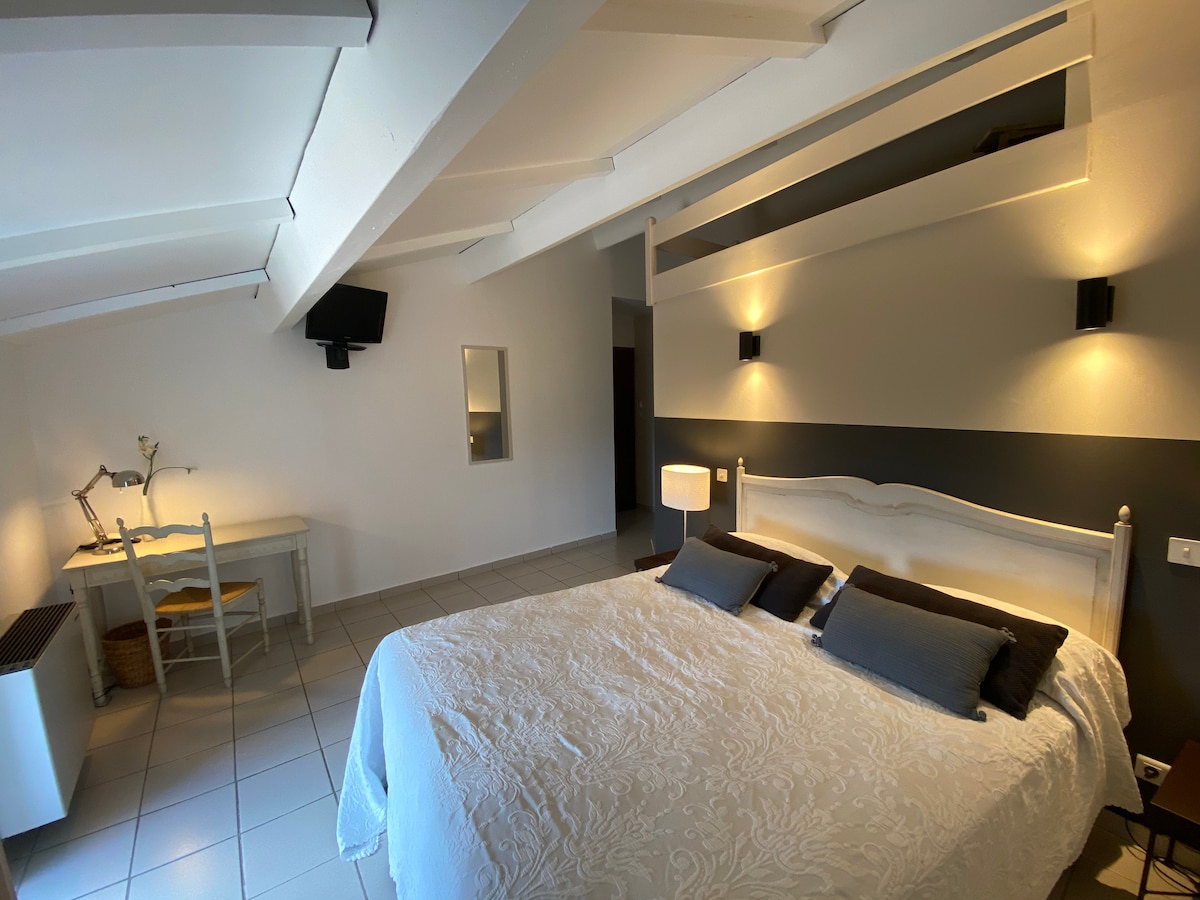 Chambre en pierres voutée pour 4 personnes, 1 lit double et 1 canapé convertible. Salle d'eau privée avec douche. Vous avez accès à l'espace piscine de notre hôtel : 1 piscine à débordement de 16x6m + 1 pataugeoire pour les enfants + 1 spa de nage de 6x4m (eau chauffée à 28 et couvert de octobre à mai). Petite aire de jeux pour les enfants, mini terrain de foot, terrain de pétanque, table de ping pong, baby foot... Sur place il y a aussi notre restaurant et bar.