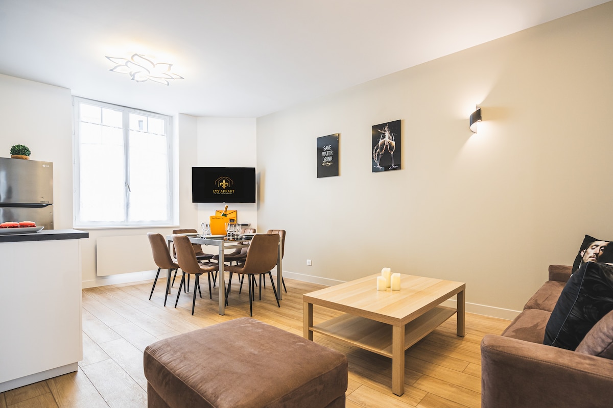 Bienvenue chez Lys’Appart ⚜ ! Posez vos valises dans ce superbe appartement intégralement refait à neuf, où tout a été pensé pour que vous vous sentiez "comme à la maison" dès la première minute pour un séjour qui pétille 🥂 !. Niché dans un passage privatif résidentiel, vous profitez du calme le plus total tout en étant au cœur battant de Reims. Le confort d'un cocon moderne, la sérénité d'un passage privé.