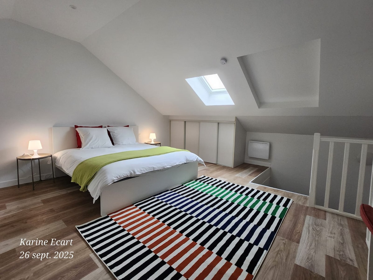Bazancourt, a 20 minutes de Reims Idéale pour les professionnels en déplacement et les voyageurs en quête de sérénité, cette chambre vous offre un cadre paisible, avec un espace bureau et une connexion wifi haut débit pour travailler en toute tranquillité. Spacieuse et lumineuse, elle est équipée pour un séjour efficace ou une retraite reposante : • Un lit double XL • Un bureau ergonomique pour travailler ou étudier • Wi-Fi fibre très haut débit • Penderie et étagères pour déballer vos affaires