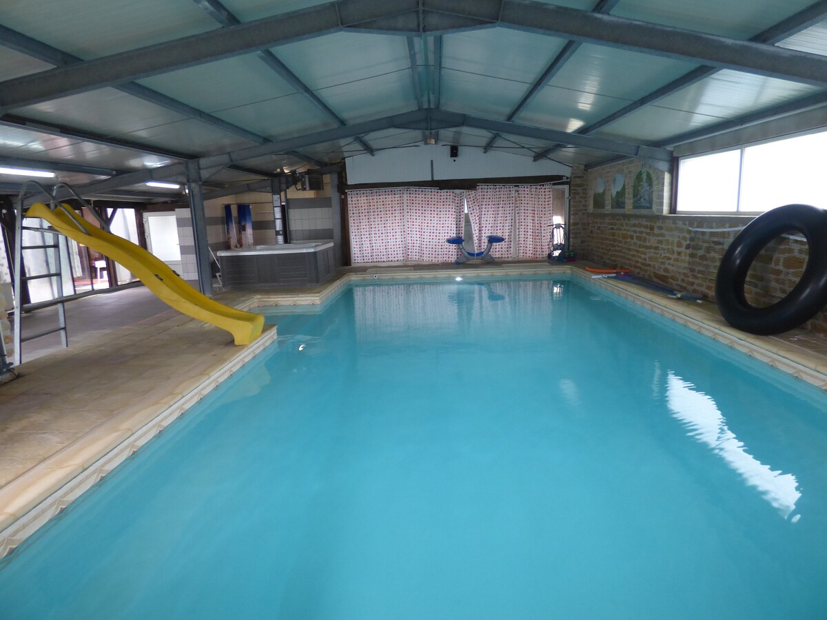 Gite accessible aux personnes avec handicap, avec 4 chambres, 1 coin cuisine, 1 grand salon salle à manger avec poêle à bois pour faire une flambée lors d'une soirée entre amis ou en famille. 1 terrasse couverte avec barbecue et salon de jardin. Accès à un espace piscine privé chauffé de 12 m sur 5,5 m (eau à 28°) situé à 150 m du lieu de résidence. En juillet, août, pour Noël et nouvel an, nous ne louons qu'à la semaine.
