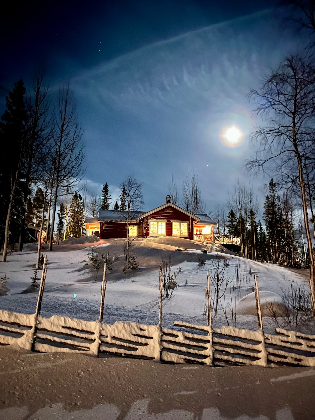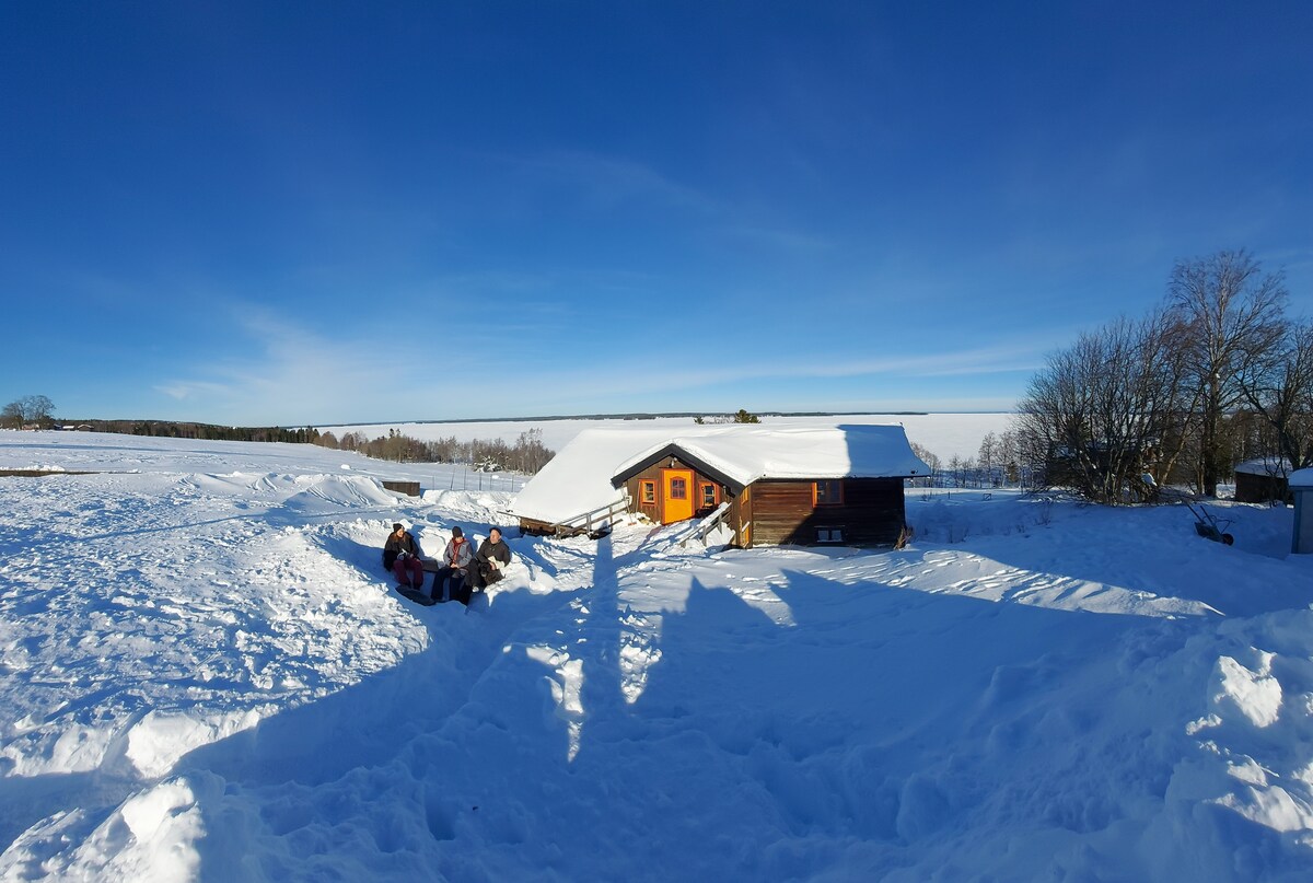 Our modern log house is situated right on a lakeshore. The open-concept design with lots of wood and light creates a warm, friendly atmosphere. On 85m2 you'll find panoramic windows with a fantastic view on the lake, a soap stone fireplace, two bedrooms and a bathroom. Enjoy fishing, paddling, swimming, hiking and x-country skiing right in front of your doorstep! Our neighbouring little farm with our kids, three sled dogs, three cats, a garden and chickens can induce a farm holiday experience.