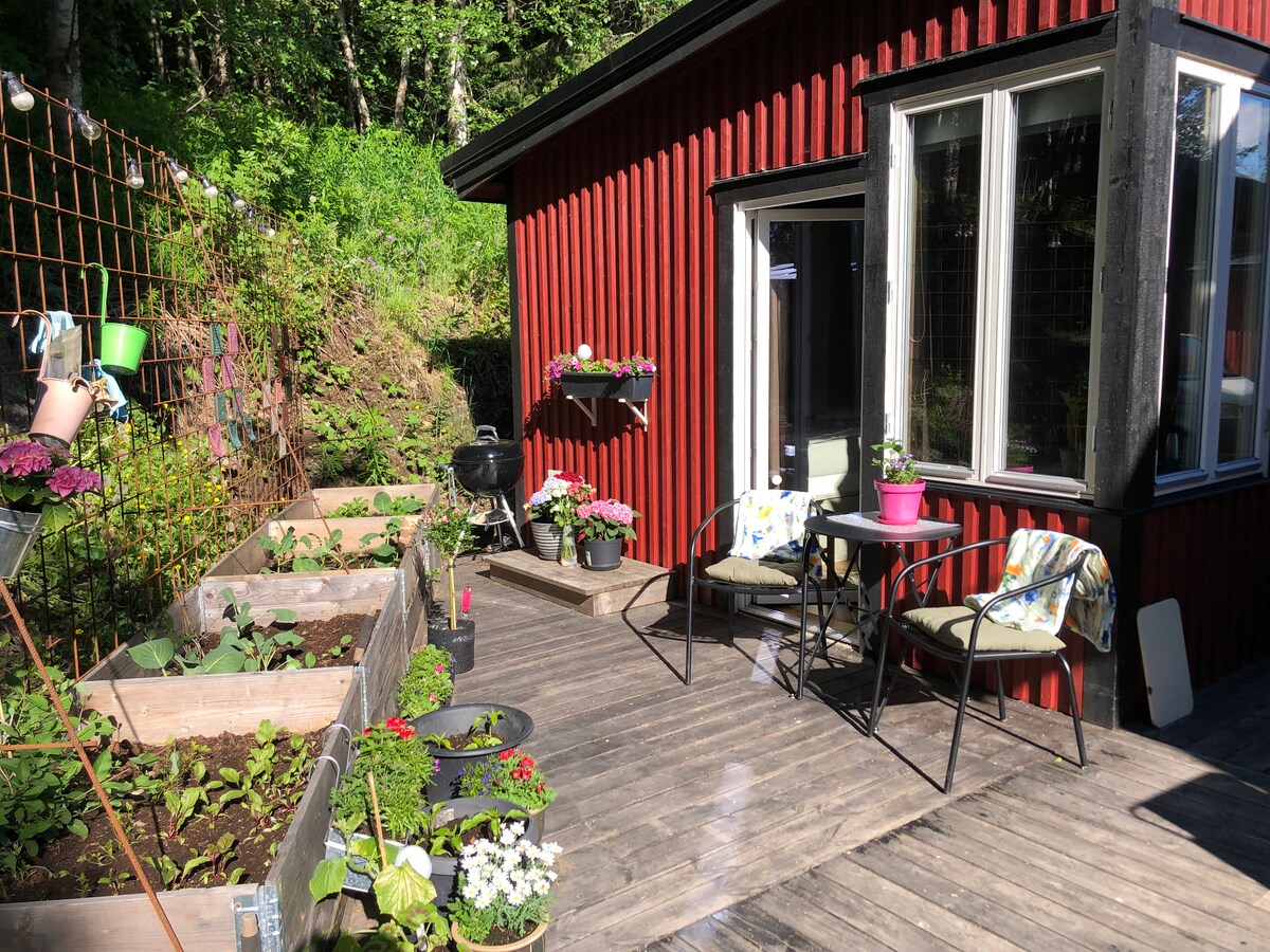 House (25 sqm). Private entrance, toilet, shower cabin & washing machine. The price includes bed linen, towels & final cleaning. One large room with a bed (140 cm), sofa (which can be used as a bed), desk. NO KITCHEN but there is a small refrigerator, micro & water boiler. As a hotel room - larger. Good storage and drying facilities. WIFI, TV with apple TV. Own part of patio. Not shoveled in winter. Parking space - by house. "Trixy" driveway up, due to road conditions.