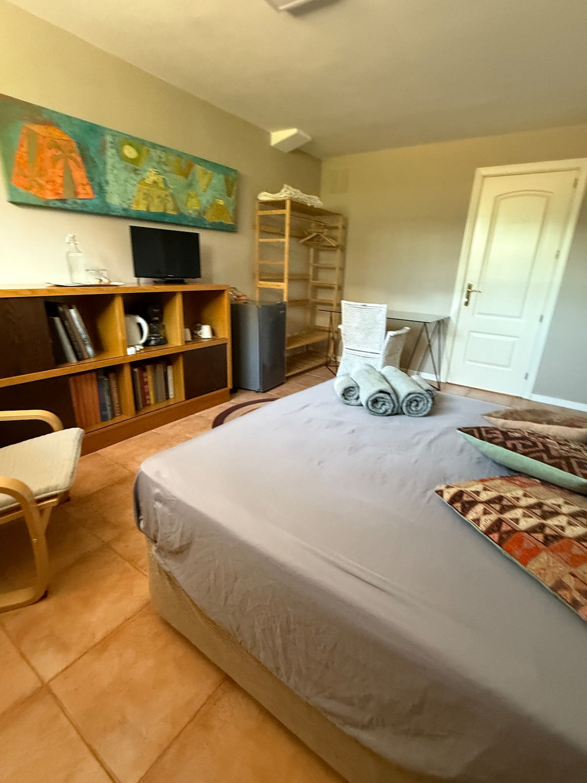 Amplia suite en planta baja, acogedora y cálida, muy luminosa; con baño independiente (plato de ducha, champú, gel y toallas), dormitorio con espacio para 2 o 3 personas, escritorio, armario y ropa de cama y sala de estar con microondas y mesa para pequeñas comidas. Desayuno y wifi protegido incluido en el precio. Jardín con cenador y barbacoa a disposición de los clientes. Se encuentra en pueblo tranquilo muy bien comunicado, con todos los servicios cerca de Madrid, Toledo, Aranjuez, Escorial..