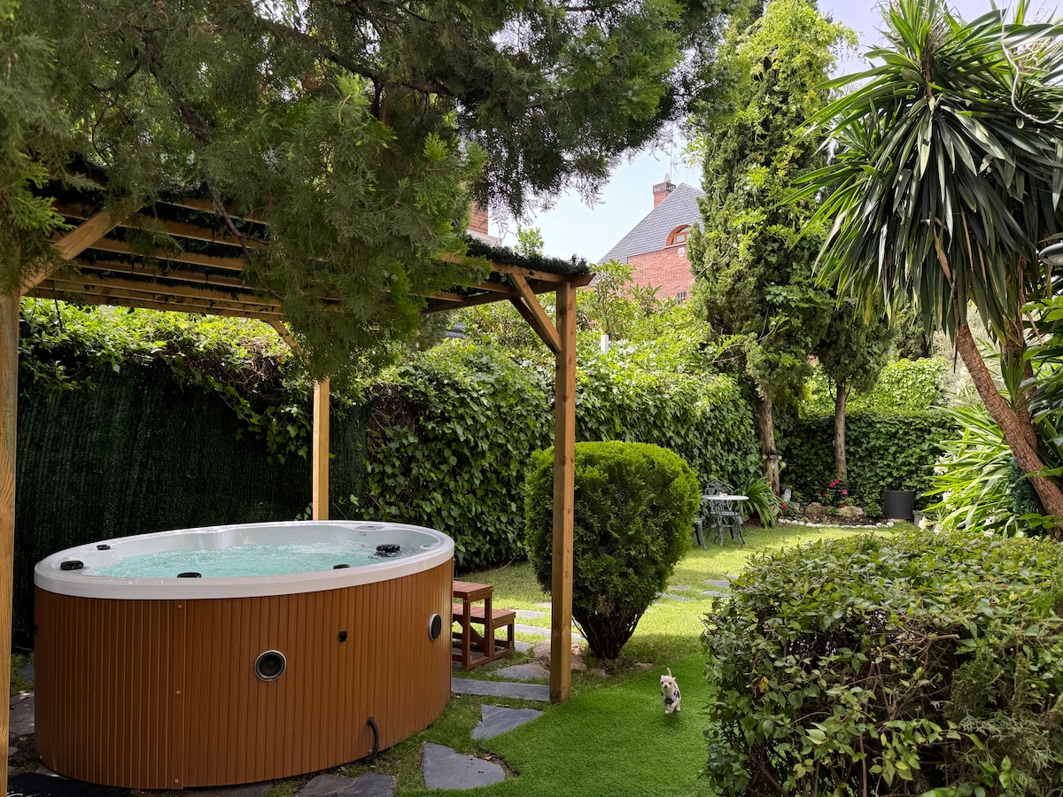 Habitación SUITE impresionante terraza privada, en la que después de un día de turismo por Madrid , podrás descansar, relajarte tomando un vino o café... Disfrutar de una ducha al aire libre y desayunar al fresco además de tomar el sol en una cómoda tumbona, en invierno hay estufa de leña de exterior eso le hace aún más cálida y acogedora. La habitación cuenta con todo lo necesario para pasar unos agradables días. Hay metro y autobuses q te llevan al centro directamente sin transbordo