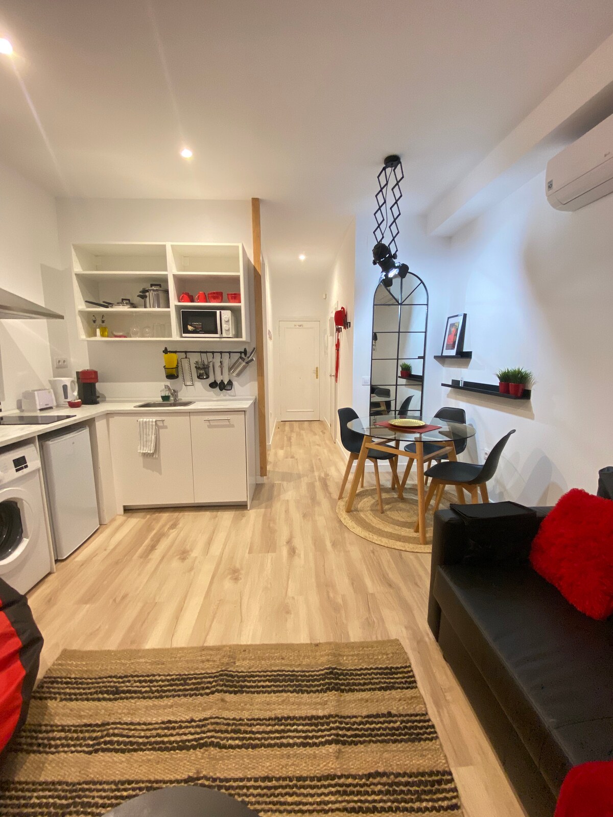 Alojamiento amplio e ideal renovado con: cocina integrada totalmente equipada con gran frigorífico, sala de estar, smartTV, cómoda habitación doble, armario y baño. Parking gratuito en la zona. Internet 5G, A/C y calefacción. Planta baja con acceso directo a la calle. Muy bien comunicado: >4 Torres , 9 mins >Torre Caleido, IE University, 12 mins >Hosp. Ramon y Cajal y tren Cercanías, 5 mins >Hosp. La Paz, 8 mins >Estación de Metro Begoña, 5 mins >Centro (Plaza de España), a 20min, metro línea 10
