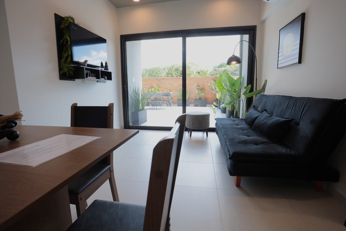 Nuestro apartamento cuenta con un ambiente moderno y acogedor. Cocina totalmente equipada, con electrodomésticos y utensilios esenciales. Wifi de alta velocidad en todo el apartamento. Check-in sin complicaciones para tu comodidad. Disfruta de toallas y productos de higiene personal de cortesía para mayor comodidad. 5 Min de los mejores Shoppings. 10 Min del aeropuerto.
