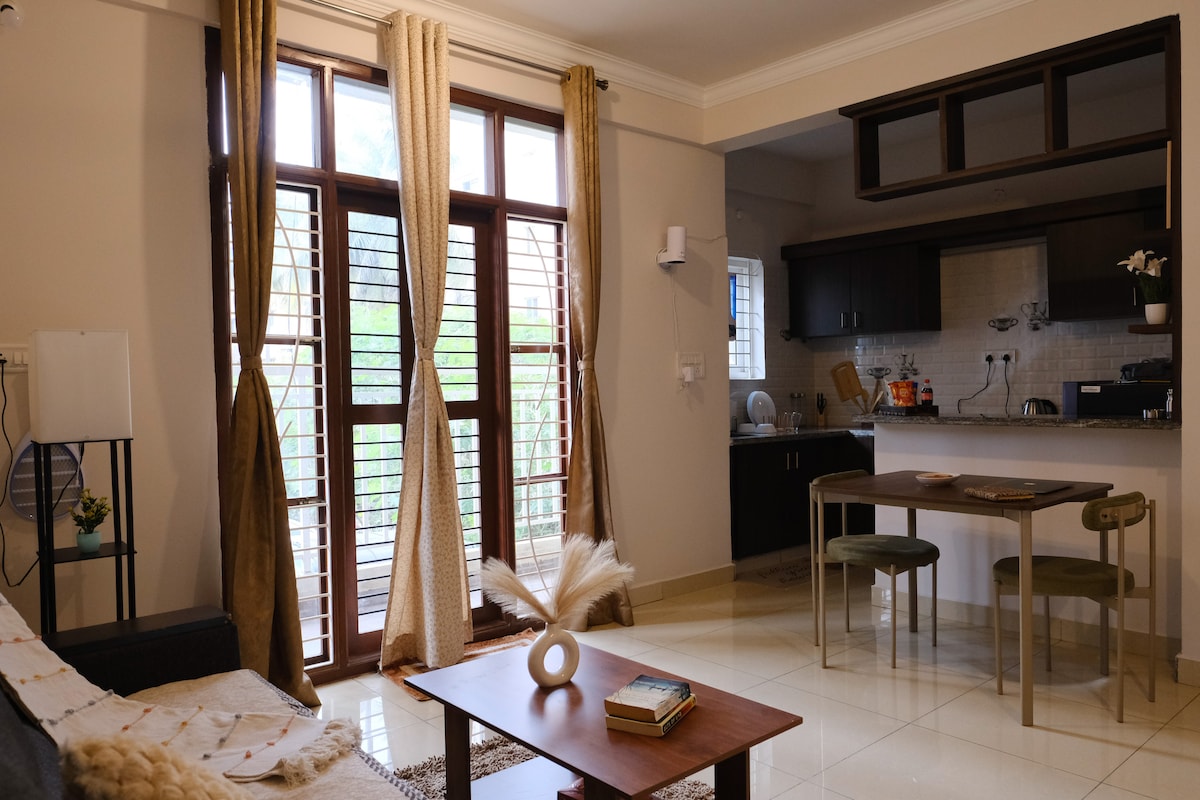 We would love to host you in our 1 BHK (EARTHY Homestay) that blends style with an earthy, peaceful vibe & unbeatable panoramas. - Balcony Oasis: Forest view + cinematic sunsets at 200 m - Prime Locale: 2 min to NIFT & 3 min to 27th Main’s cafés, boutiques & street‑food - Serene Interiors: Queen bed, ambient lighting & lush live plants - Work & Play: High‑speed Wi‑Fi, Large TV and fresh air Experience style, serenity & spectacular sunsets—all in one cozy retreat! - 5th floor (No Lift)