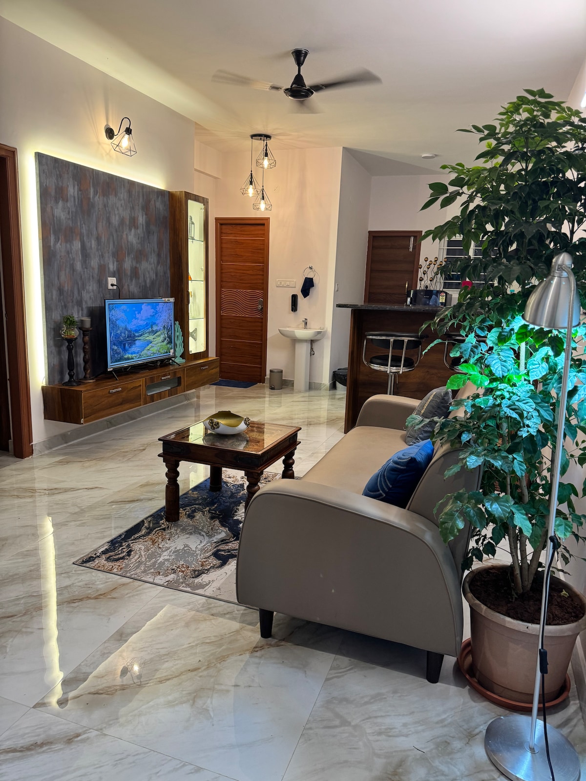 Welcome to our brand new, spacious 1-BHK flat, ideal for couples and families seeking comfort and convenience. The bedroom boasts a queen bed and soft orthopedic mattress for a restful night's sleep. Relax in the large living room with a 43-inch Smart TV, lightning-fast WiFi and dedicated workspace. Comes with a super clean bathroom stocked with essentials. The fully equipped kitchen includes basic ingredients, high-quality appliances, and crockery for your culinary adventures.