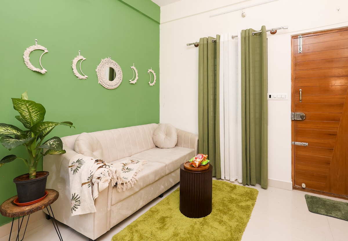 We would love to host you in our 1 BHK (EARTHY Homestay) that blends style with an earthy, peaceful vibe & unbeatable panoramas. - Balcony Oasis: Forest view + cinematic sunsets at 200 m - Prime Locale: 2 min to NIFT & 3 min to 27th Main’s cafés, boutiques & street‑food - Serene Interiors: Queen bed, ambient lighting & lush live plants - Work & Play: High‑speed Wi‑Fi, Large TV and fresh air Experience style, serenity & spectacular sunsets—all in one cozy retreat! - 5th floor (No Lift)