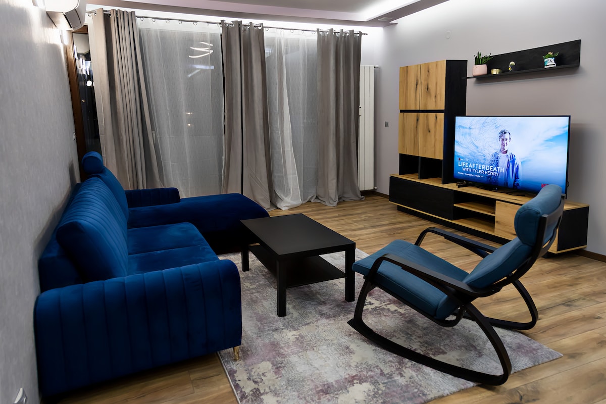 Stay in this modern apartment on the 2nd floor with elevator access. A 10-minute ride to the airport and city center, it's only 100 meters away from one of Sofia's largest shopping malls, located in a quiet business area. Enjoy free NETFLIX, fast WIFI, coffee, and free underground parking. Equipped with air conditioning, a 50" 4K smart TV, washing machine, dryer, hair dryer, iron, and more. The hosts are happy to recommend local hotspots but the place is all yours.