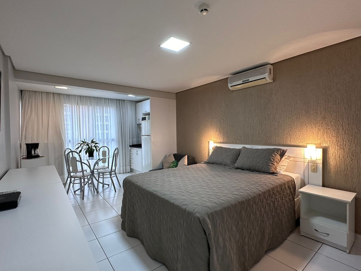"Excelente localização - Shoppings e Restaurantes perto - Fácil acesso, check in e check out realizados de forma rápida e eficiente". • Piscina na cobertura • Academia • Restaurante panorâmico • Cama Queen - Colchão de ar com bomba elétrica • Ar Condicionado • Wi-Fi • Microondas e Cooktop • Frigobar •Toalha e lençol - máquina de café Nespresso (sem cápsulas) Obs: MENORES DE 18 ANOS viajando sem os pais deverão portar autorização autenticada em cartório destes. OBS: NÃO FUMANTES