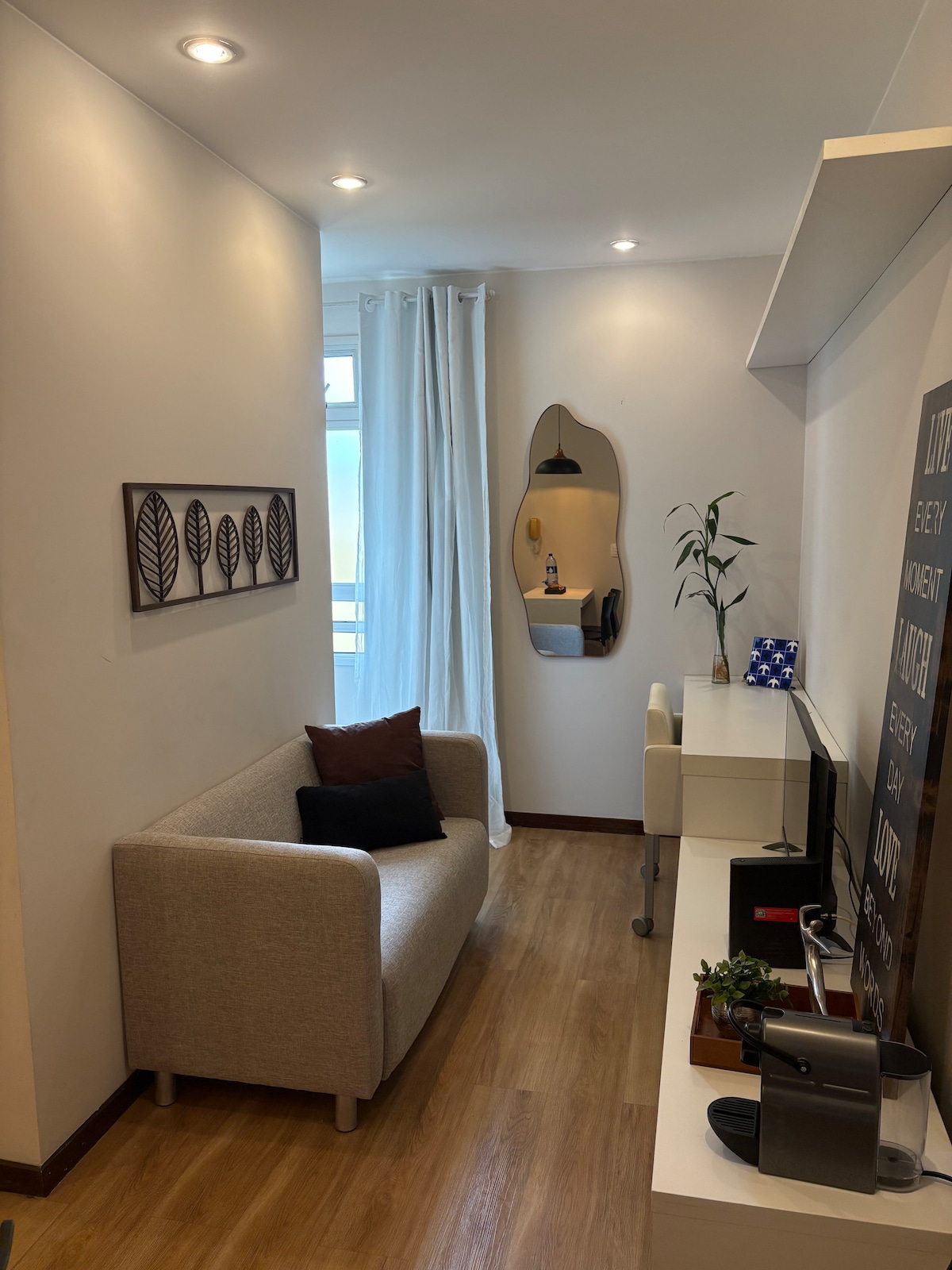 Abrace o estilo neste lugar tranquilo e bem localizado. A unidade "Praiana" é o seu lugar com estilo, tranquilidade e localização perfeita em Brasília. Está localizada no Plano Piloto e fica a poucos passos de Supermercado, restaurantes, farmácia 24h, padarias, salão, cafeterias. Disponibilizamos máquina lava e seca na unidade. É um PEQUENO espaço (18 m²) que possui tudo que você precisa. Cozinha equipada, secador de cabelo, ferro de passar roupa e uma decoração única. Decorada por design!