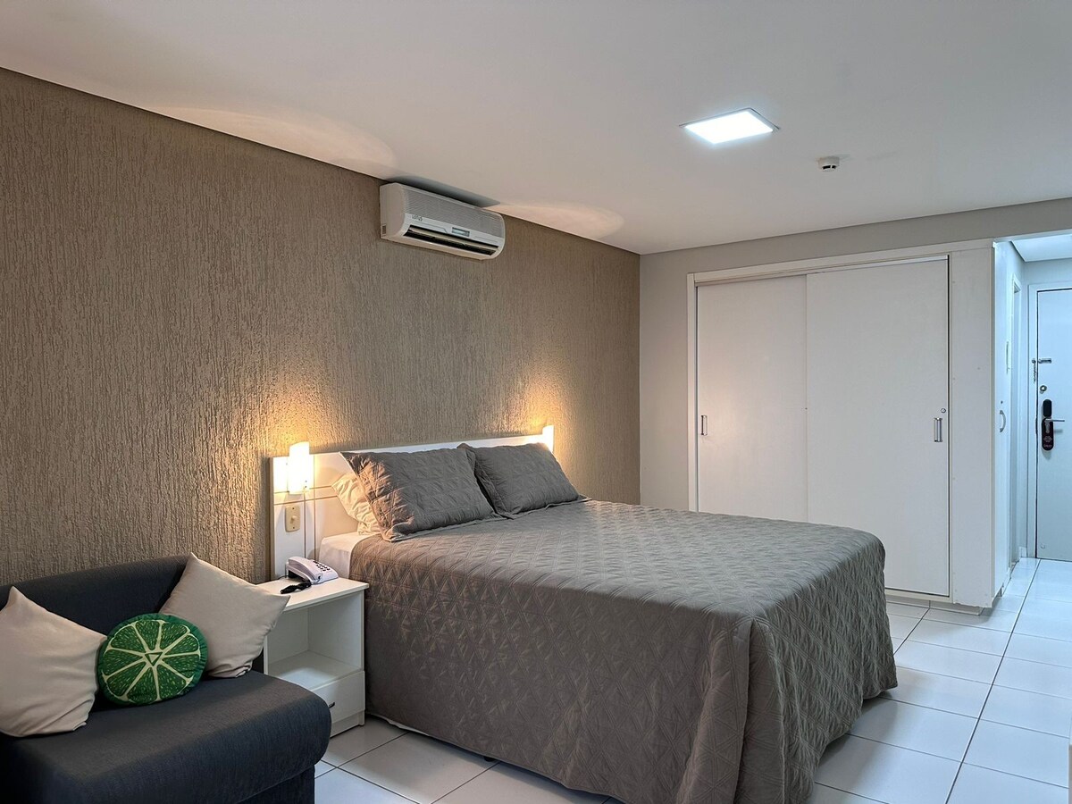 "Excelente localização - Shoppings e Restaurantes perto - Fácil acesso, check in e check out realizados de forma rápida e eficiente". • Piscina na cobertura • Academia • Restaurante panorâmico • Cama Queen - Colchão de ar com bomba elétrica • Ar Condicionado • Wi-Fi • Microondas e Cooktop • Frigobar •Toalha e lençol - máquina de café Nespresso (sem cápsulas) Obs: MENORES DE 18 ANOS viajando sem os pais deverão portar autorização autenticada em cartório destes. OBS: NÃO FUMANTES