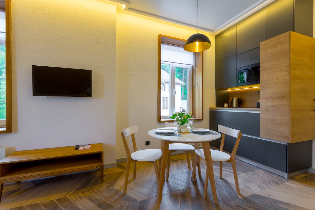 Designed for the convenience of a modern traveler, this place will make you feel like home. We've given a modern look to this space while preserving the original features of the XIX-century construction. We hope for guests understanding in case of power shortages due to the current situation in Ukraine, which are out of our control. Artisanal window shutters and original ceiling materials were added to make it unique and cozy.