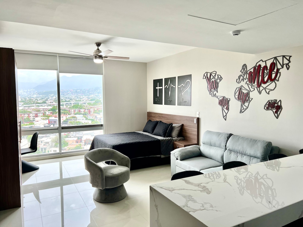 ¡Bienvenido a Monterrey! Pongo a tu disposición mi espectacular departamento: Tendrás una inmejorable vista panorámica a toda la Ciudad y las magníficas Montañas que nos rodean. Sin olvidar el acceso a una alberca en el último piso del edificio y para ejercitarte está a tu disposición un gimnasio. Conoce la cultura local y explora los rincones más pintorescos de la ciudad y disfruta de su vida nocturna en Barrio Antiguo (Cafeterías, Bares, Restaurantes y la Mejor vida nocturna de la ciudad.