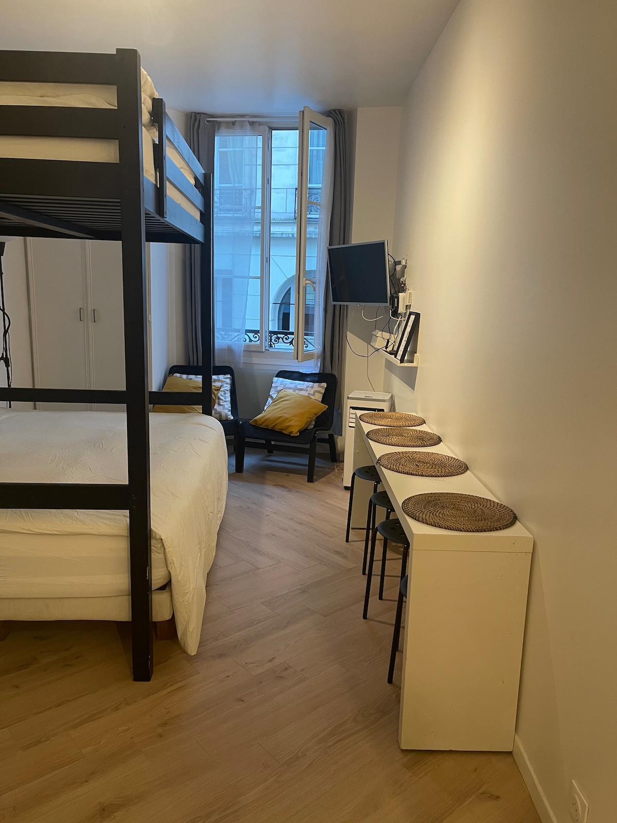 Studio familial de 26 m² à 5 min du Louvre, idéal pourBienvenue dans votre cocon parisien à 5 min du Louvre 🖼️ ! Ce studio de 26 m² au 1er étage d’un bel immeuble ancien (escalier facile, pas d’ascenseur) accueille jusqu’à 4 pers. avec ses 2 vrais lits doubles dont un en mezzanine. Vous profiterez d’une cuisine équipée, du Wi-Fi et d’une TV et d’une salle de bain design avec douche. Quartier vivant avec cafés et commerces à deux pas ✨ idéal en famille ou entre amis pour (re)découvrir Paris.
