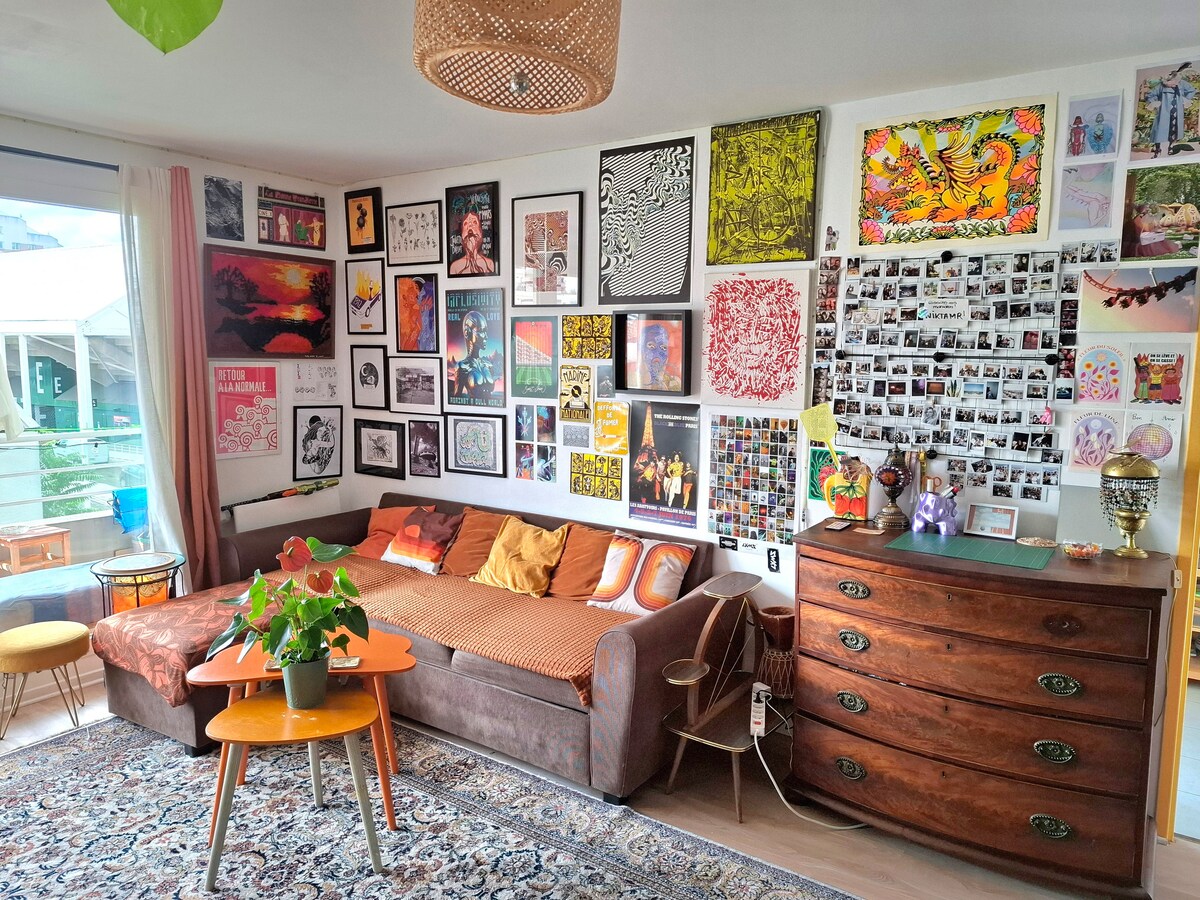 Ce qui rend notre appartement unique, c’est avant tout la proximité immédiate du stade de France, qui est à 50mètres seulement. ⚐ Le style de l'appartement a été pensé pour vous permettre de passer de supers moments: la table de salon est convertible en table de billard, air hockey, ou tennis de table. ❤︎ Vous pourrez vous divertir avec vos amis ou votre famille tout en profitant de la vue dégagée depuis le balcon sur la basilique Saint-Denis et le canal Saint-Denis, sans aucun vis-à-vis. ☼