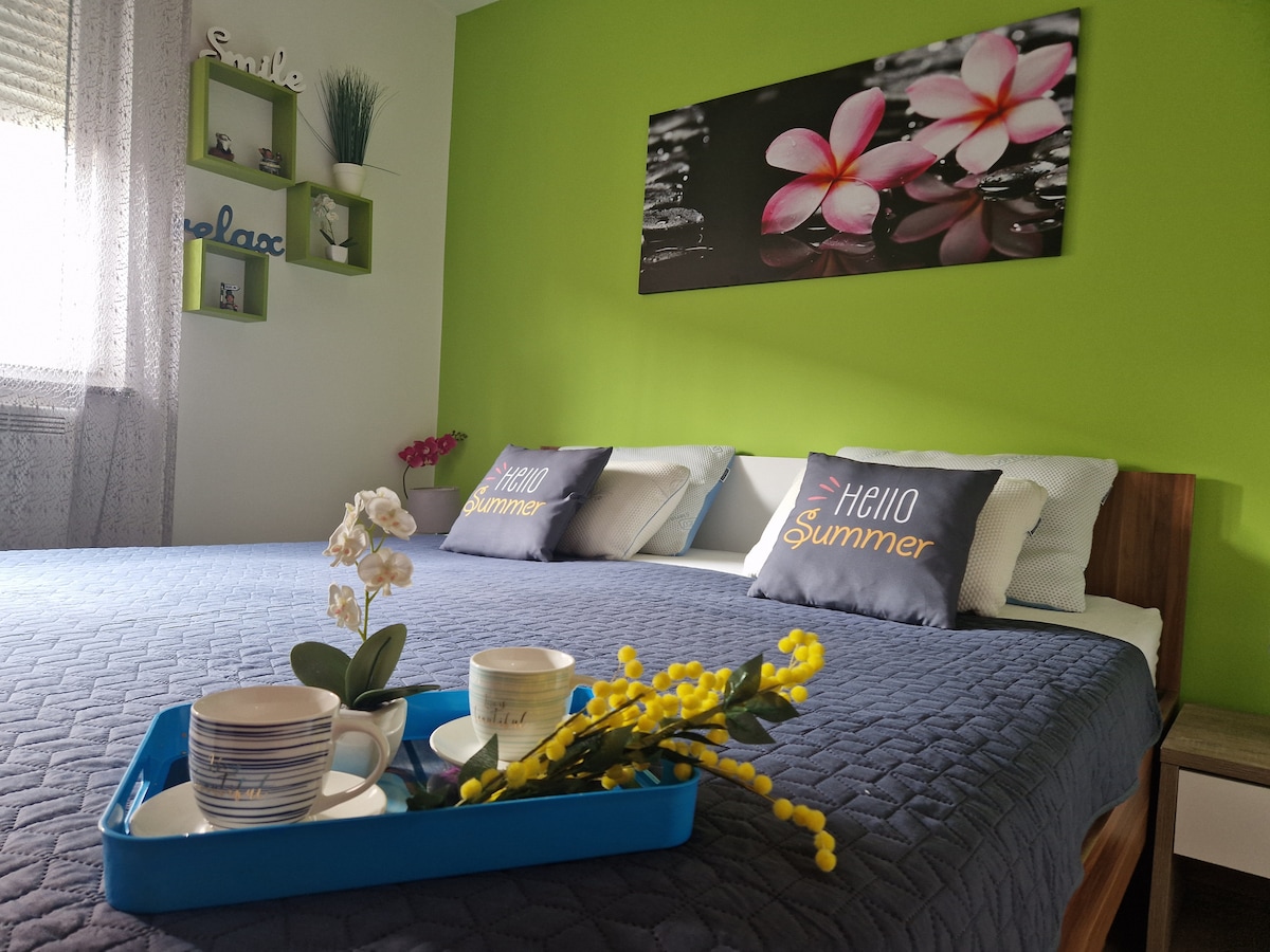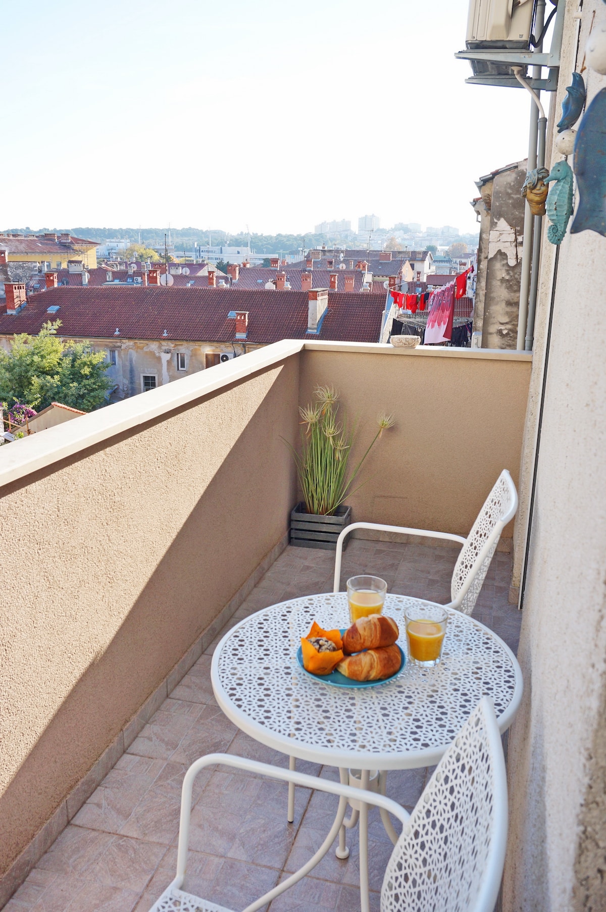 Artistic, elegant and comfy brand new renovated two bedroom apartment in the very center of the city just at the corner of the entrance to the old town. The living room offers a beautiful view of the parks, greenery and the Roman amphitheater where you feel like you can touch it. From the kitchen bathed in flowers you can enjoy your morning coffee with a unique view before going to explore the city or enjoy your afternoon peace.