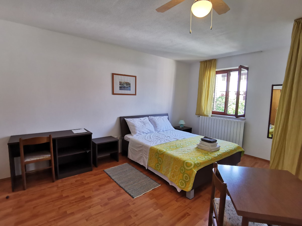 An apartment situated on the first floor, above the garden, 65 m2 big + balcony 18 m2 consisting of: Master bedroom with double bed,180 cm x 200 cm TV SAT, fully equipped kitchen (oven, fridge, dish-washer, coffee appliance) with a dining table, air condition, private bathroom with shower and bidet. Highlight: The apartment has a large private balcony 18 m2, on the south - western side of the house. Our guests usually have breakfast on this balcony with a wooden furniture set.
