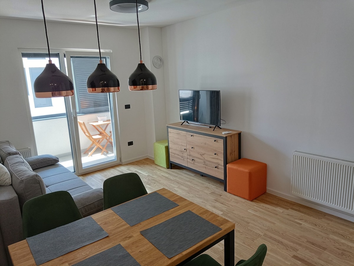Nicely furnished apartment in a newly built quiet residential building near the center of Pula. Nearby there is a shopping mall center with many shops and supermarkets. Bus lines quickly connect you to the city center and other destinations. It is located on the third floor of a newly built building with an elevator. The apartment is equipped with all necessary devices and air-conditioned. In front there is Your own free parking place.You will be able to enjoy your morning coffee on the balcony!