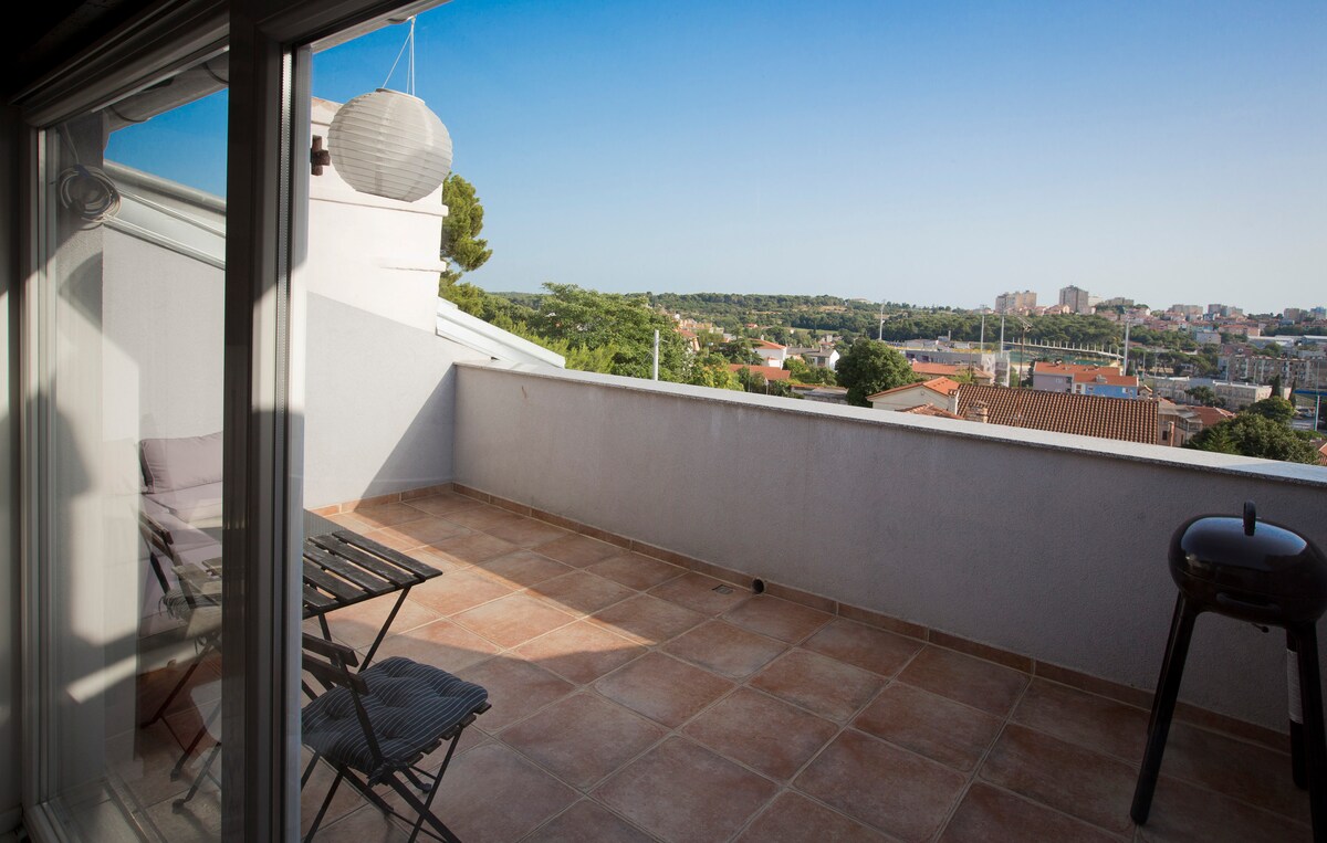 The apartment (35m2) with huge terrace (35m2) with amazing view is located only 30m away from the Coliseum. The apartment is placed on the 4th floor of the residential building (no elevator), free reserved parking place is in closed building courtyard. All the magic of Pula Old Town is literally on your doorstep. Near to all historical sites and close to many cafes, bars, restaurants, shops, boutiques. Air-condition, wifi internet, upon request we can provide a baby crib.
