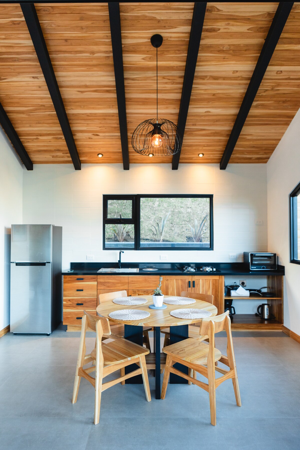 Jaguar Houses is conveniently located between the center of town and some of the most popular attractions in the area such as Canopy Zip Lining, Suspended Bridges and the Santa Elena Nature Reserve. Inspired by Nordic architecture, Jaguar is composed of 3 independent homes, elevated on pillars, giving you the impression of floating on the trees. The 3 houses are identical however the view can slightly change from one to another. The photos used for each listing are a mix of the 3 houses.