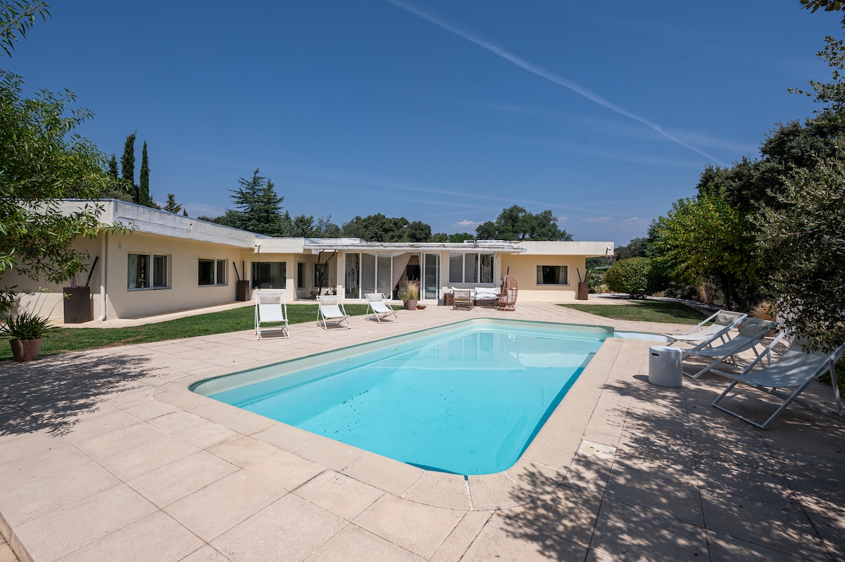 Experience well-being in an independent house with a pool, nestled in a finca surrounded by horses. Enjoy bike rides, a terrace with panoramic views to admire the sunset, and the tranquility of our village square with ancient olive tree. Just 30 minutes from the center of Madrid, this retreat offers complete disconnection with easy access to shops. Ideal for a weekend or vacation, experience a truly Spanish lifestyle. Pool closed from October to April depending on the weather