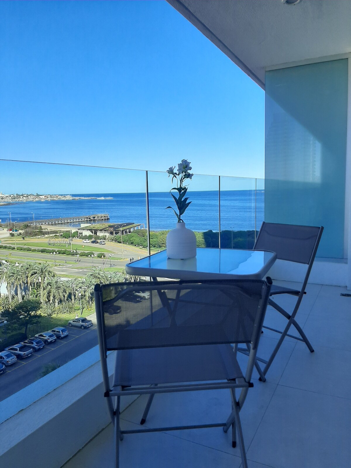 Precioso apartamento con vistas al mar a 120 metros de la playa, 1 dormitorio, living, baño, cocina y balcon, totalmente equipado y super comodo. El edificio cuenta con piscina climatizada interior con un jacuzzi , gimnasio, recepcion, dos piscinas exteriores y parrillero , un parrillero en la terraza con vista a la playa Mansa y la Brava y tambien parking. En una zona llena de restaurantes, mercados y mas. 😊