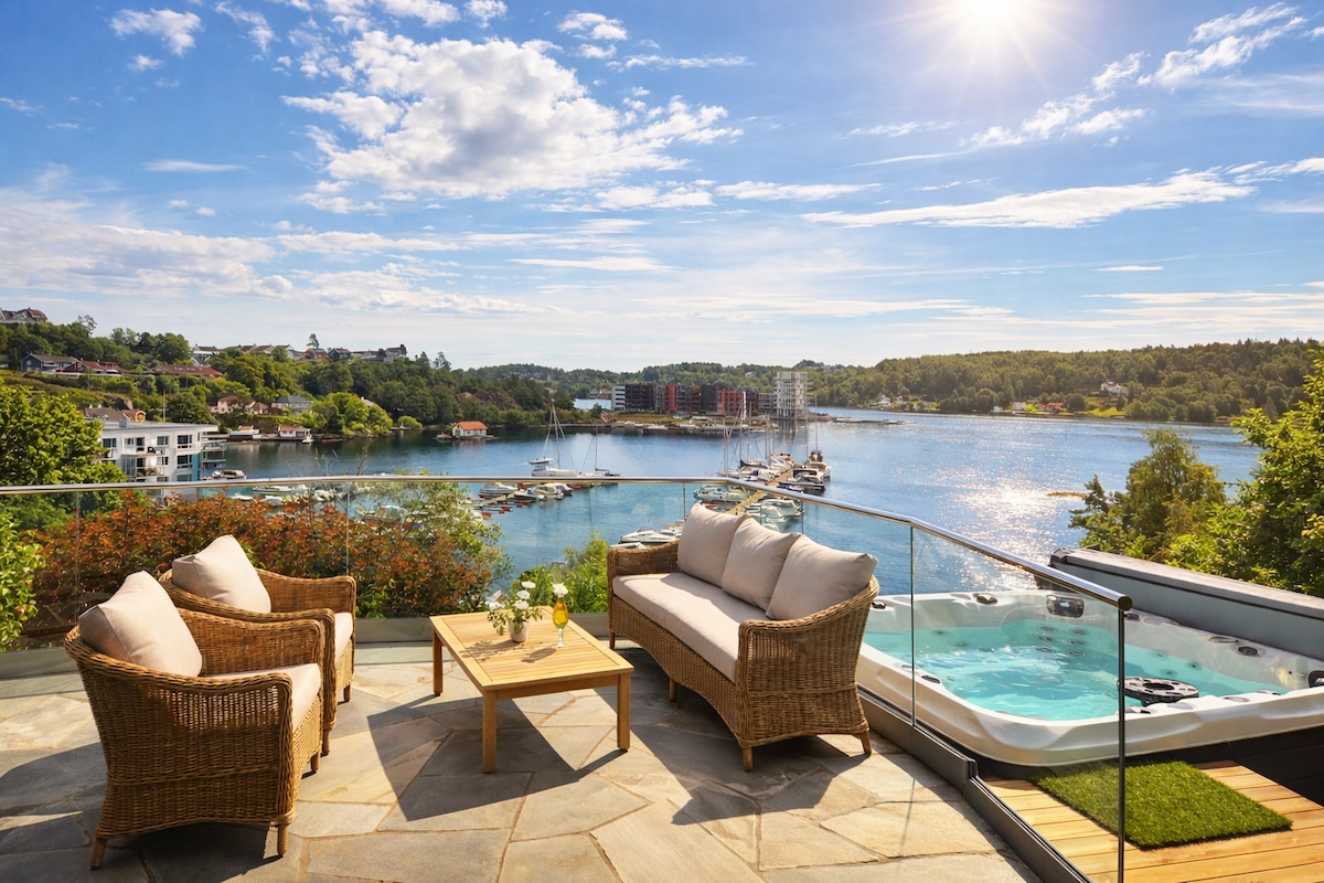 Enjoy breathtaking sea views from this cozy apartment! Relax in the hot tub, up to 7 guests, available all year round. Bedroom 1 with double bed (180 cm), Bedroom 2 has a family bunk bed for 3 and is separate from the main apartment (see photos). The living room offers a sofa bed with soft toppers and a double sleeping alcove ( 75x165 cm). 55" smart TV with Chromecast. Fully equipped kitchen and bathroom. 5-minute walk to the nearest bus stop. Let us know if anything is missing.