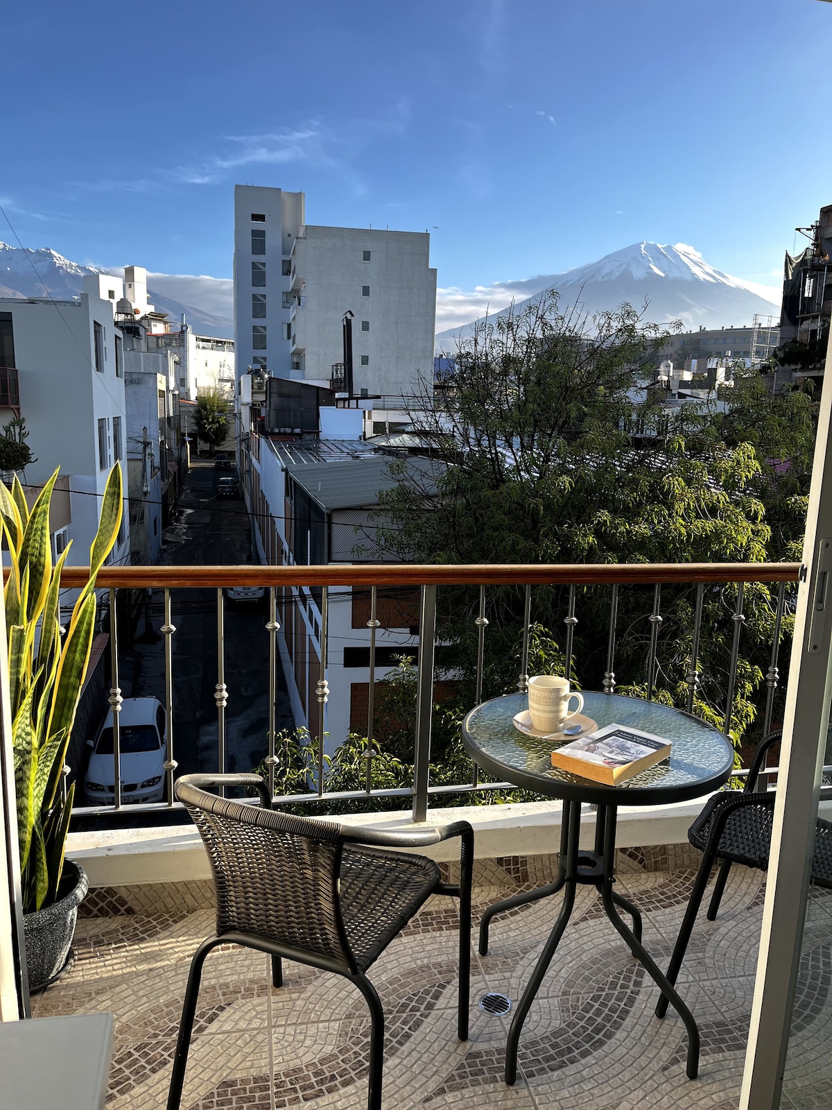 Enjoy your stay in the White City in a comfortable and bright studio just a 15-minute walk from the historic center. Ideal for enjoying Arequipa's sunny days, with views of the volcanoes from the balcony. The studio is equipped with all basic appliances. It includes a private bathroom, 24-hour hot water, and internet connection. The building features an elevator, an internal patio, and a portal with video surveillance.