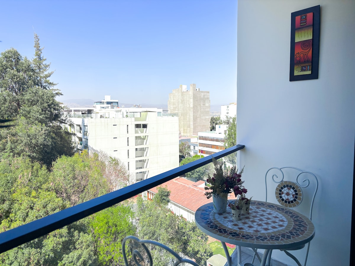 Mini departamento con cochera y ascensor, cama de dos plazas y cómodo sofá cama de dos plazas en zona residencial en Cayma. Totalmente amoblado. Wifi rapido y estable, netflix y cable en HD, excelente vista a los volcanes de Arequipa desde la habitacion, cochera dentro de el mismo edificio. Urbanizacion cerrada y con vigilante las 24 horas. A 5 min a pie de la plaza de Cayma, menos 5 min en auto de la Av. Ejército y 12 min en auto aprox del centro histórico y aeropuerto ✈️