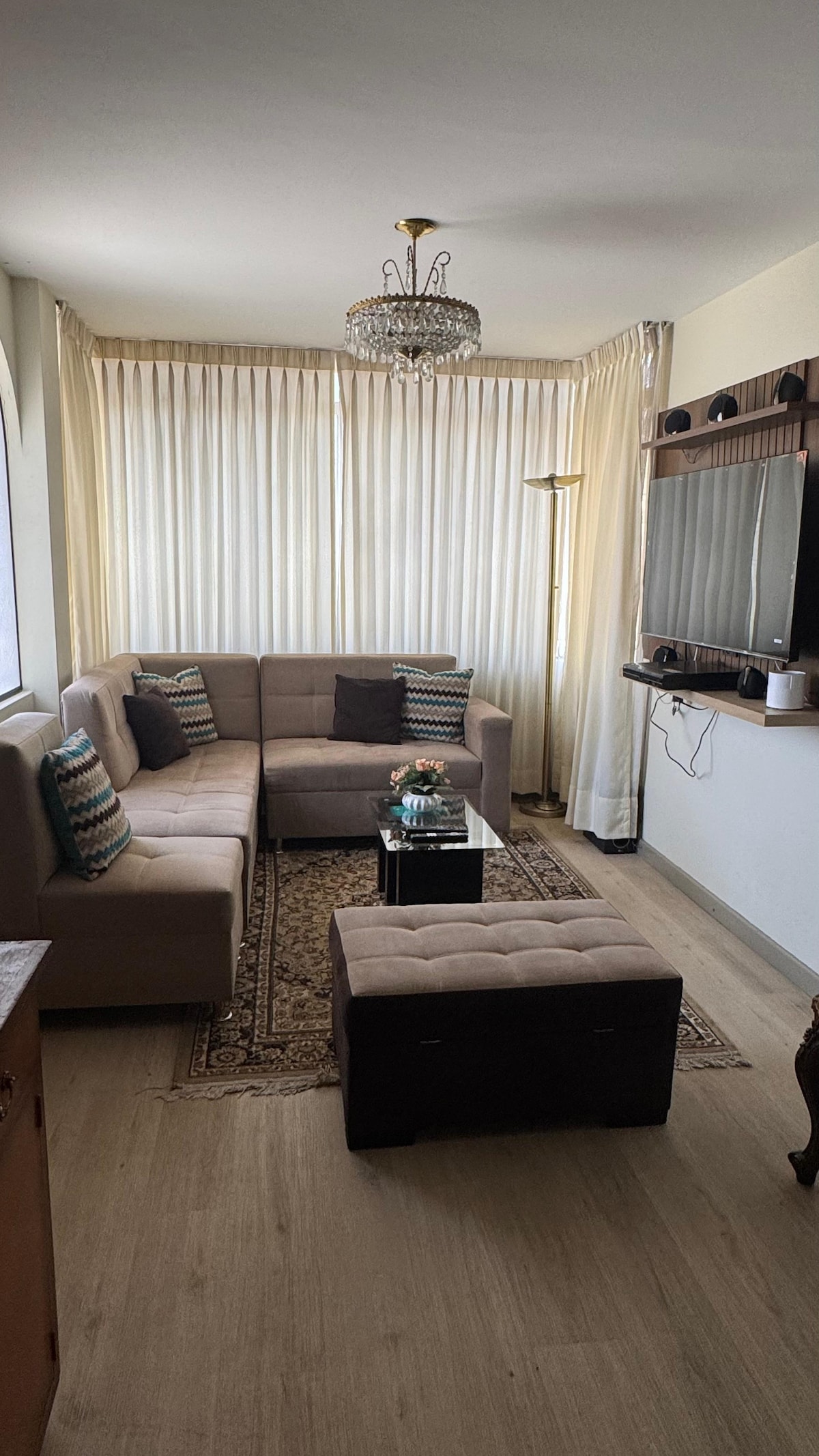 Perfecto departamento para una estadia placentera con acabados de primera y cama king size!!! Vistas panoramicas a un paso del corazón financiero y comercial de Arequipa con seguridad privada. Los principales actractivos de la ciudad estan a pocos minutos caminando como la plaza de Yanahuara y la plaza de Cayma donde podras disfrutar de la mejor gastronomia de la local. Disfruta de una experiencia con estilo en este alojamiento céntrico. Piso 5 edificio familiar sin ascensor.