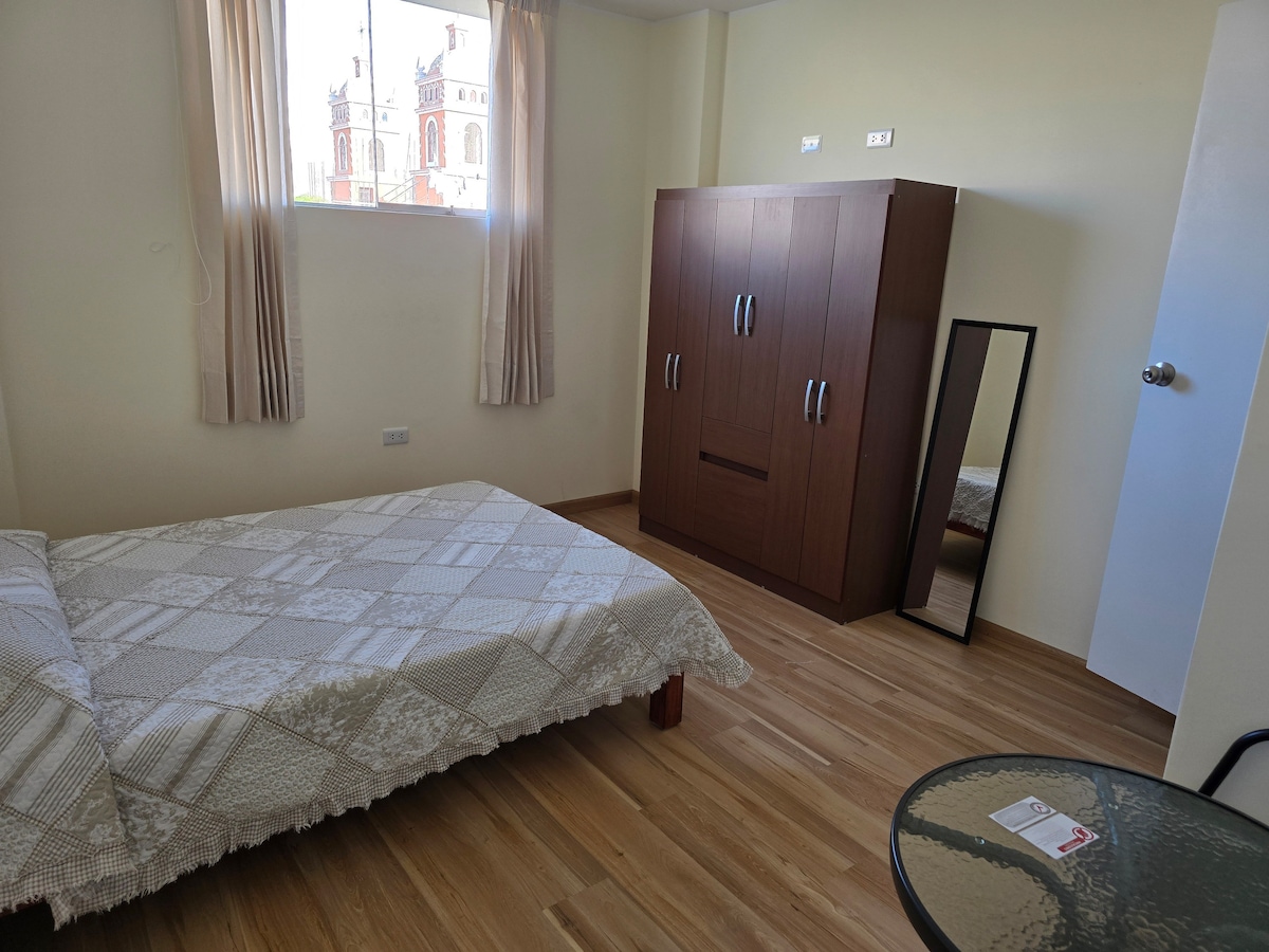 Departamento a 5 min del Mall Aventura Zona tranquila, completamente equipado TV con WiFi Netflix y Amazon Zona residencial 1 habitación con cama King y 1 Sofá cama king a 10 min del centro de la ciudad y cerca la campiña 1 baño Cocina completamente equipada con estufa a gas y por inducción Cámaras de seguridad controladas desde la sala Lavadora y secadora de ropa cerca al terminal terrestre Se presta indicaciones y facilidades para realizar turismo Estaremos gustosos d recibira su familia