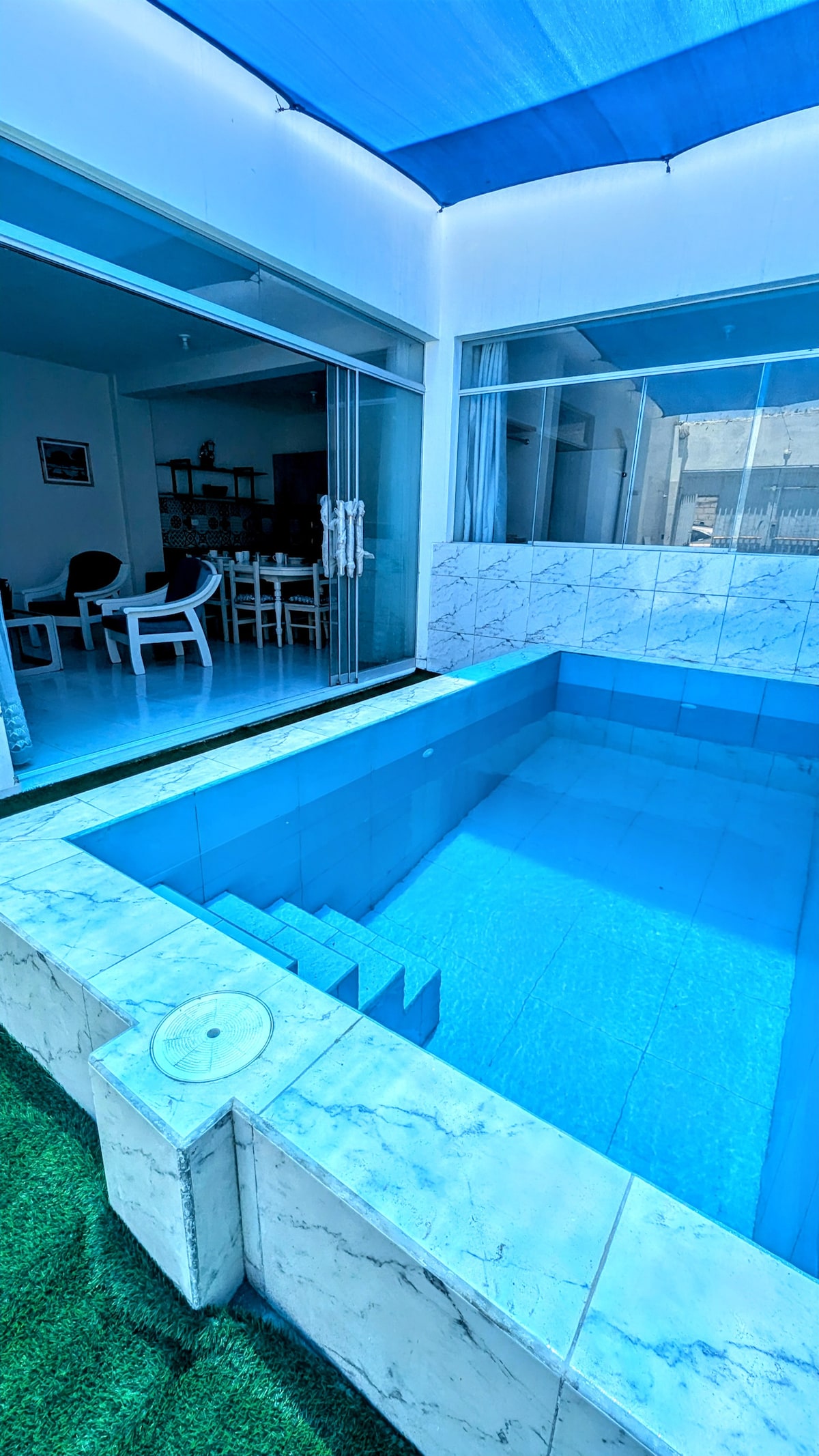 Consta de una sala con TV de 65” NETFLIX para su total distracción, además tiene un equipo de sonido para su comodidad. Un comedor, una cocina equipada con artefactos y menajeria completa para su estadía. Tiene tres dormitorios c/u cama 2 plazas, televisores Smart en c/u y mesas con sillas, con ropero empotrado uno de ellos tiene un baño privado y los otros 2 con baño compartido. Cuenta con cochera. Tiene agua caliente todo el día y una buena señal de WIFI. Cuenta con acabados de primera.