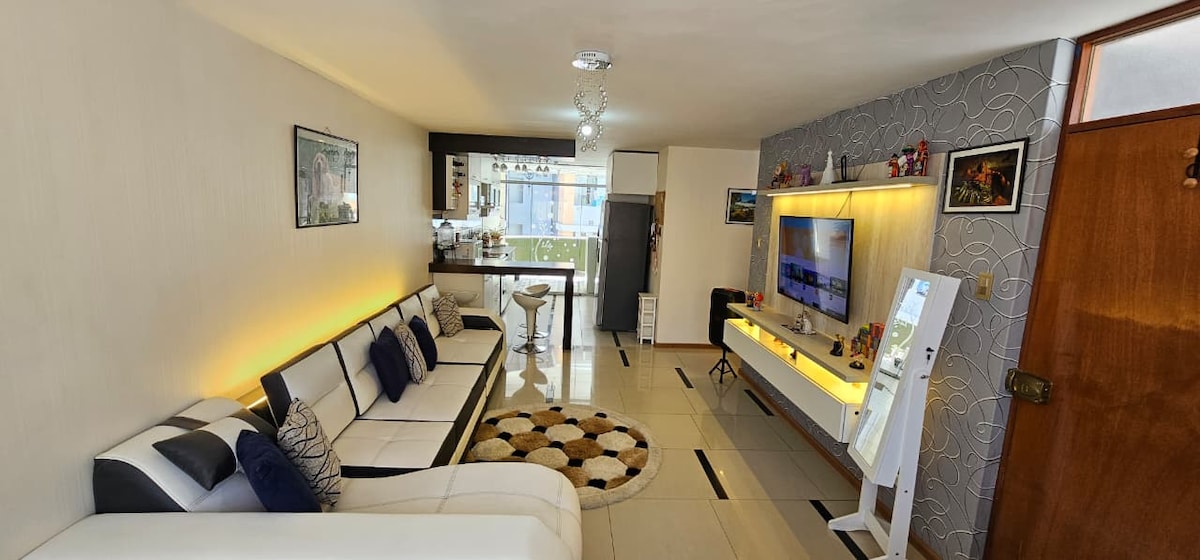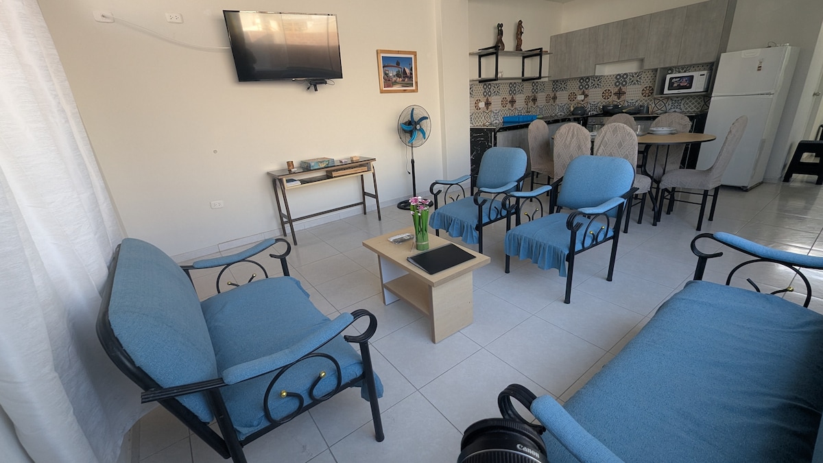 Lindo departamento, centro de Mollendo, cerca de todo!! A pocos pasos de la playa, Boulevard, parques Bolognesi y Grau, restaurantes, Malecón Ratti y comercios. Cuenta con: - 3 habitaciones, 3 camas de 2 plazas, 2 camas de plz y media, 1 sofá cama - 2 baños completos con sistema agua caliente. - Sala, comedor, cocina americana equipada y lavandería-lavadora. -Menaje de cocina, ropa de cama y toallas - TV Cable Wifi Ideal para disfrutar de una estadía cerca del mar en el corazón de Mollendo