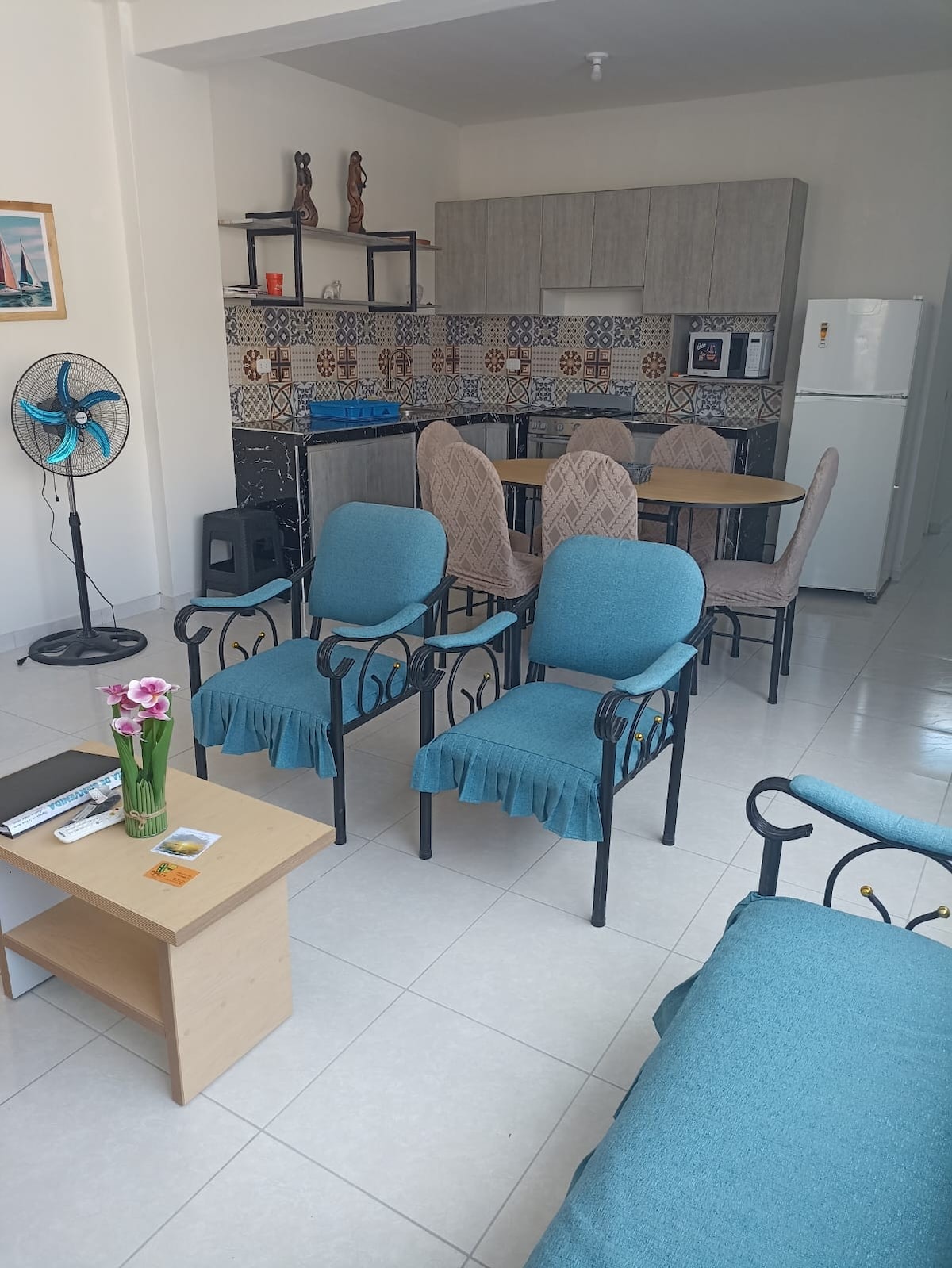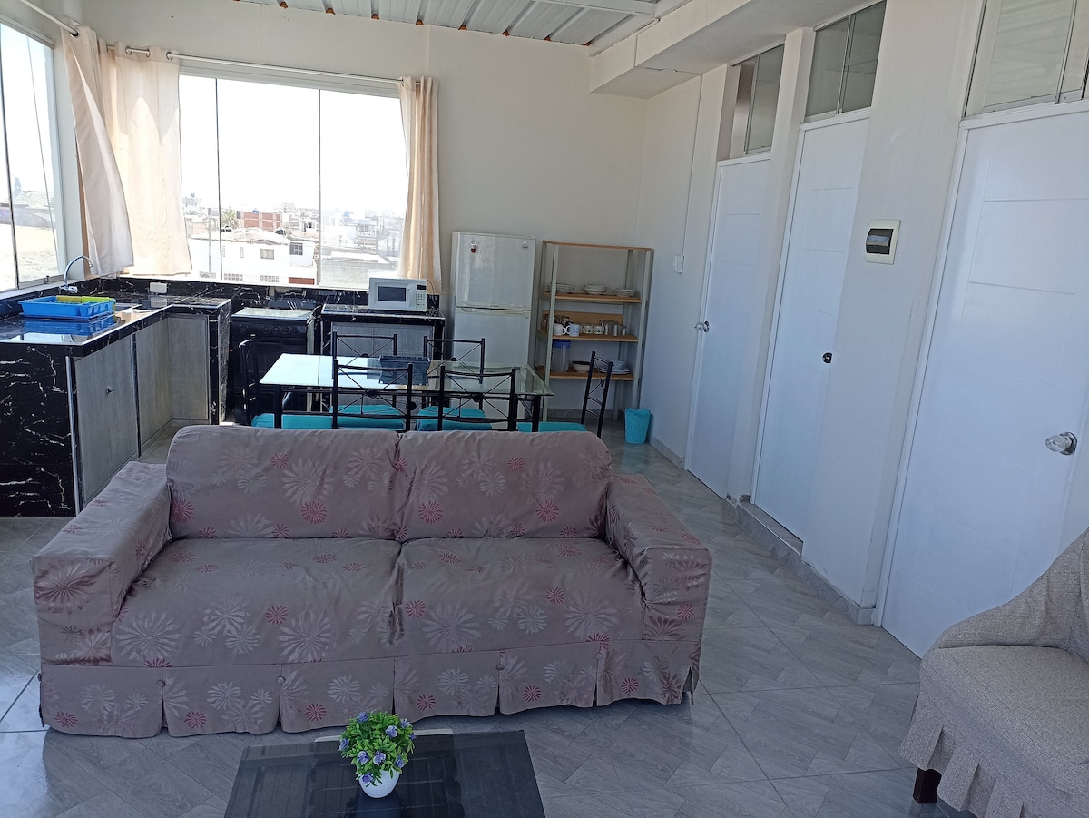 Moderno departamento AMOBLADO Ubicado a sólo 5 minutos (EN AUTO) del centro de Mollendo (plazas, mercado, etc.) y 7 minutos (EN AUTO) de Catarindo - Cuenta con 01 habitación amplia con DOS CAMAS de 02 plazas, TV de 40¨ y baño completo con ducha y agua caliente las 24 horas - Área de cocina equipada con electrodomésticos, mesa de comedor y pequeña sala de estar con ½ baño, sofá y TV de 40¨ INCLUYE: Agua potable, luz, WiFi, uso de COCHERA y terraza compartida