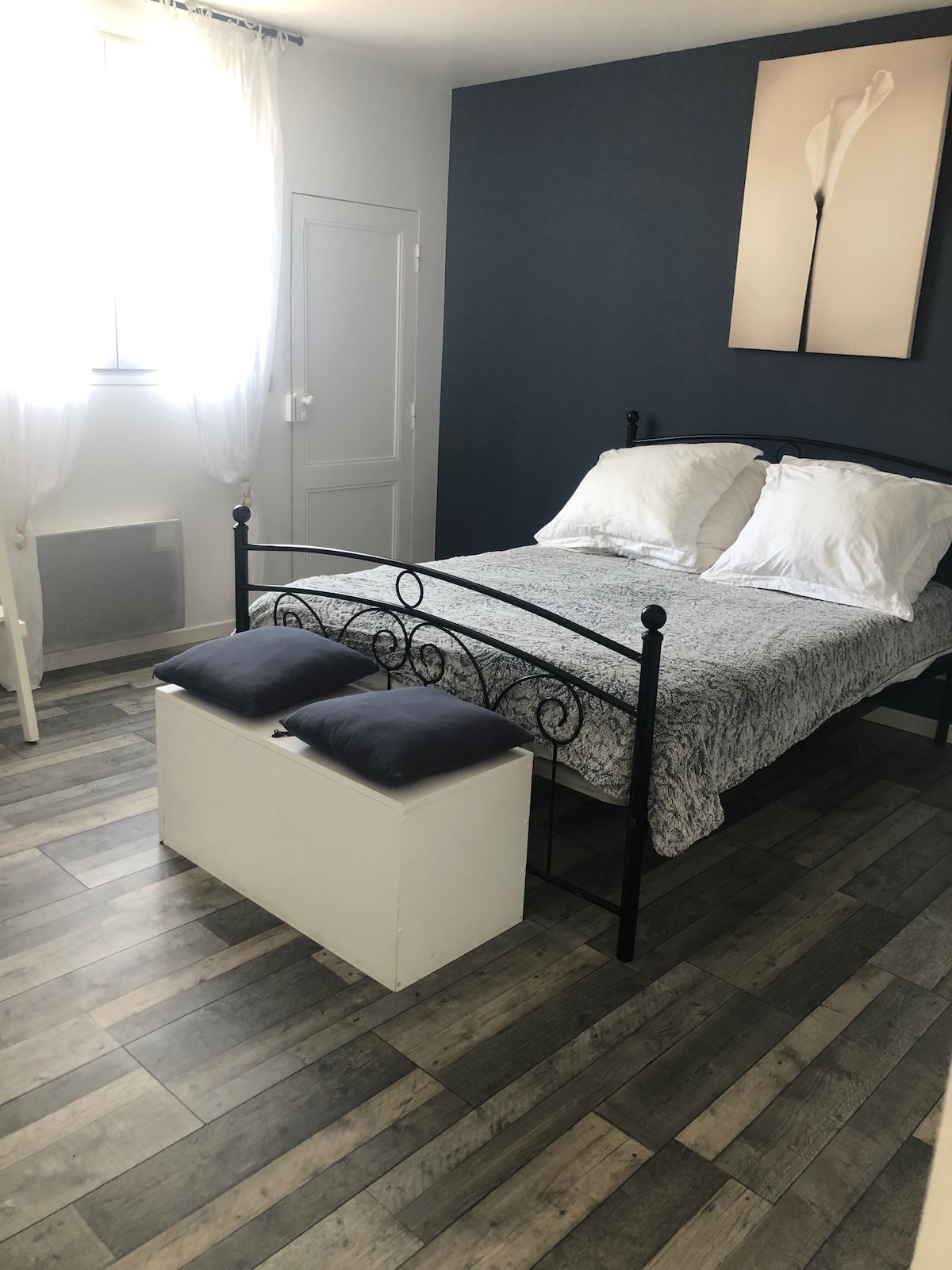 Vaste chambre d'hôte avec salle de bains privative et coin cuisine. Lit 160X200, coin salon. Petit-déjeuner inclus. Table d'hôtes possible le week-end. La chambre est située dans un bâtiment autonome et dotée d'une entrée extérieure indépendante. Centre ville, plage et port ostréicole accessibles en 10 à 15 min via la piste cyclable (prêt de vélos possible). La plage océane du grand Crohot est à 20 min en voiture.