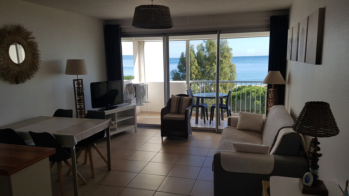 Vue Mer à 180°C, accès direct plage 30 sec, à 2 min du Costa Blanca (Alimentation, boulangerie, pharmacie), à 5 min à pieds des plages privées et clubs nautiques, à 10 min à pieds du centre allées commerçantes et activités enfants (jeux gonflables et manèges) et activités nocturnes (Bar, boîtes, Casino). A 30 min de l'Espagne (Le Perthus). 2h de Barcelone. Logement tout équipé, y compris draps, serviettes de bain, éponge, savon, shampoing, papier toilette… Ménage non compris, doit être fait
