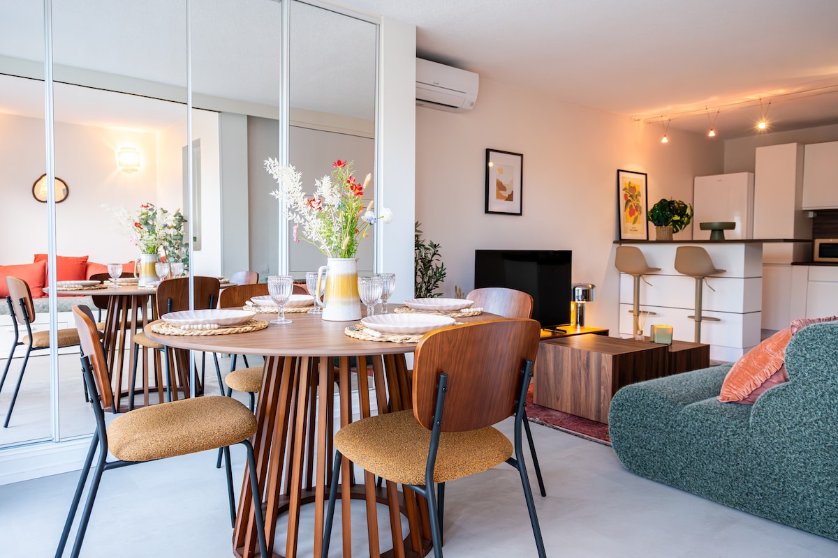 Profitez d'un logement T2 élégant et climatisé dans une résidence neuve avec parking privé fermé et ascenseur Situé à moins de 5min à pied de la plage, à côté de tous commerces et de l’office du tourisme Balcon 15m2 : table et salon Cuisine équipée : plaque induction, four, micro-onde, réfrigérateur-congélateur, lave-vaisselle, lave-linge, étendoir Chambre : lit coffre 140/200, placard Salon : canapé-lit 140/190, TV, wifi SDB : douche/WC/lavabo, sèche-cheveux Locaux vélo et poussette fermés