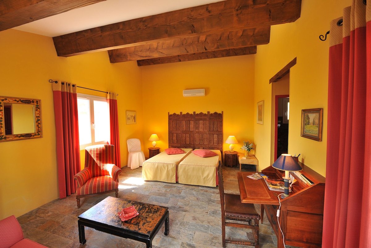 Chambre spacieuse de plus de 25m² dans Mas de 400m² et propriété de 5000m². Lit 180cm, possibilité 2 lits simples. Coin salon avec 2 fauteuils. Accès direct terrasse et piscine. Exposition sud avec vue sur jardin et montagnes. Grande salle de bain avec baignoire balnéo et douche italienne. Chambre située dans une maison d'hôtes de 5 chambres au total. Petit déjeuner en option.