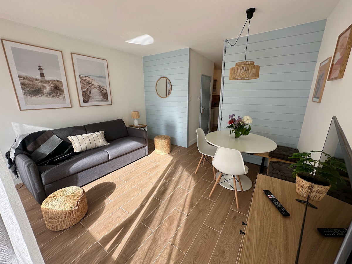 Nous vous accueillons dans notre studio de 28m2, situé à 350m de la plage, refait à neuf et entièrement équipé et climatisé. Terrasse exposée plein sud à l’abri des bruits de la rue, afin de passer de beaux moments au soleil. La place de parking attitrée, au sein de la résidence sécurisée, vous permettra de laisser votre voiture et de tout faire à pieds (plage principale, commerces et restaurants à 5 minutes). De nombreuses randonnées et activités sont à découvrir dans cette région magnifique!