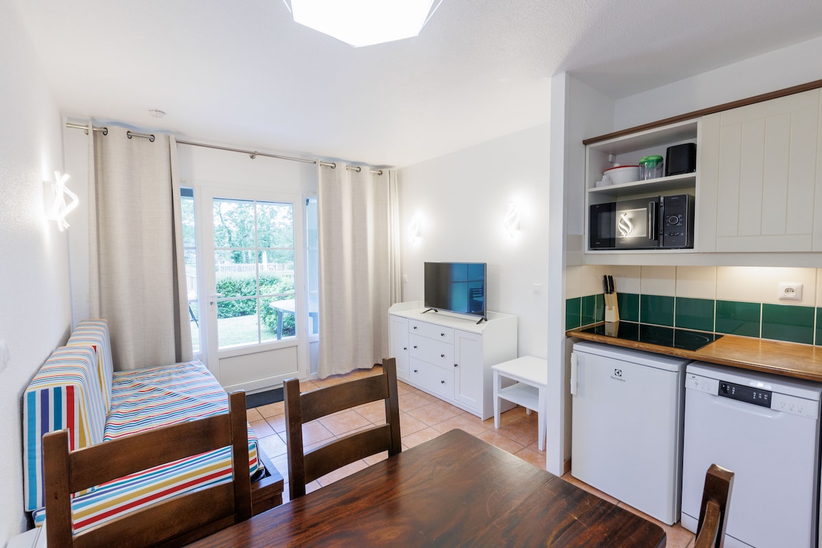 LINGE DE LIT & DE TOILETTE NON INCLUS Résidence calme "Les belles rives", T2 de 27 m² Rez-de-chaussée du + calme des 3 bâtiments, terrasse privée couverte - vue sur le fleuve Dordogne et accès direct à sa berge et au parcours No kill de pêche à la mouche Une chambre avec lit 140x190 2 lits 80x180 au salon (2 matelas, sur banquette canapé et gigogne dessous) Couettes & oreillers à disposition Piscine extérieure chauffée, accessible des vacances de Pâques au 30 sept NON OUVERTE LE RESTE DE L'ANNEE