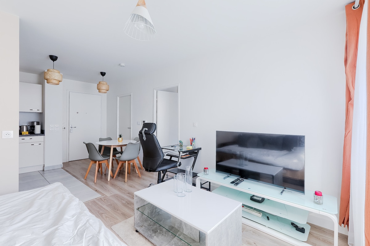 Charmant appartement de 38 m2 dans une résidence de 2021, calme et sécurisée et situé à 15 minutes du plus grand quartier d'affaires d'Europe, La Défense. Parking privé disponible. L'appartement dispose d'une cuisine totalement équipée avec des électroménagers de qualité. Salle de bain confort avec une magnifique douche à l'italienne. Rétroprojecteur pour une ambiance cinéma. Un balcon exposé Sud-est et sans vis à vis. Linge de lit, serviette, café et tout le nécessaire fournis.