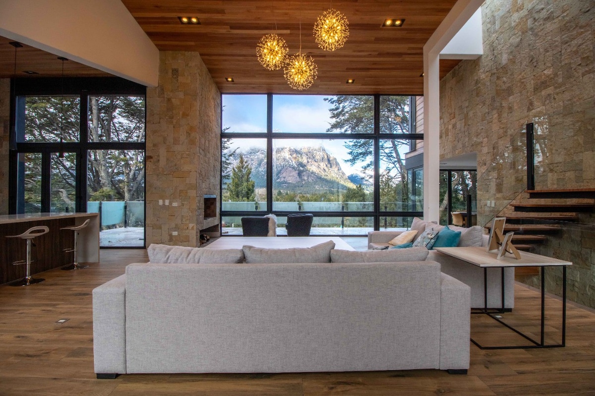 Inspired by The Views, this unique architectural designed modern home allows great views from every room. The house is well located in Arelauquen Country Club near Lago Gutiérrez gate. It is ideal for entertaining with wine cellar. mudroom and a great room that includes living, dining and a gourmet Kitchen . Four bedrooms en-suites, including two master bedrooms. And 6 bathrooms. Four additional beds in familyroom with kitchenette. This Unique super modern mountain house can host 12 guests
