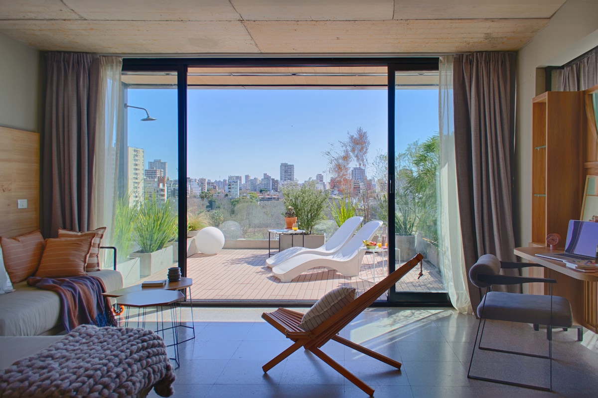 Elegante y acogedor loft de diseño para máximo 4 huéspedes. En pleno barrio de Palermo Hollywood cuenta con todo nuevo y completamente renovado/equipado. Un 9º piso con una gran terraza, muy luminoso y con una gran vista abierta a la ciudad. Muchas de las atracciones de la ciudad pueden visitarse a pie o mediante cualquier medio de transporte público (excelente conexión con metro, trenes y autobuses). En una zona muy tranquila pero a pocos metros de parques, bares, restaurantes, museos, etc!