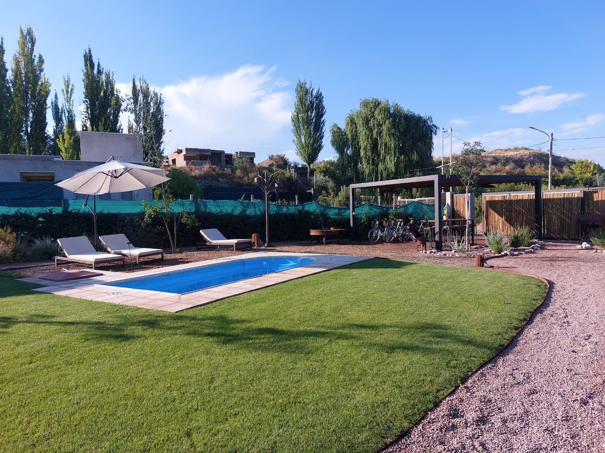 Es un hermoso lugar, que cuenta con un patio grande, tiene un vista impresionante de la pre-cordillera y es un lugar muy tranquilo, ideal para relajarse y tomar sol. No cuenta con pileta, pero si posee un arroyo donde se puede tomar mates y disfrutar del aire fresco.