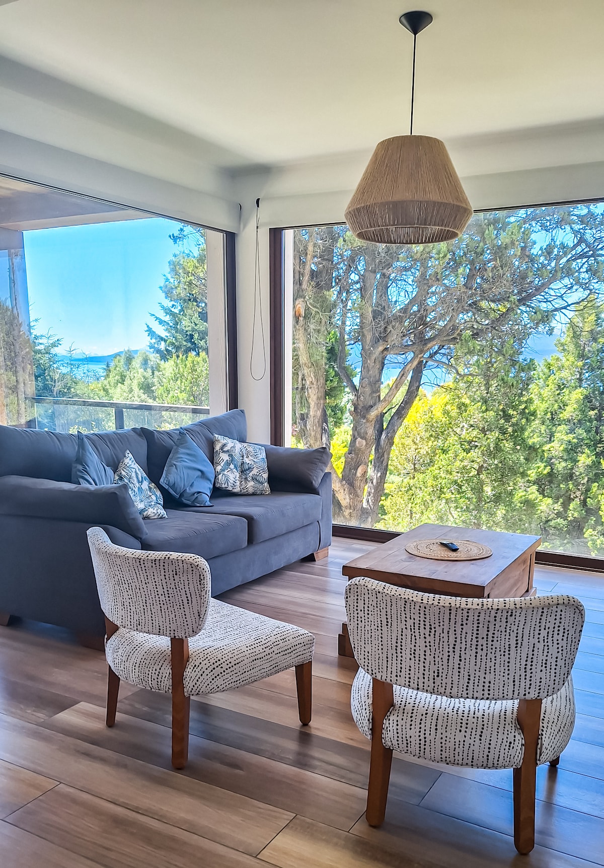 Casa en Villa La Angostura con espectacular vista al lago en barrio Bandurrias. El río correntoso está a 1.9km caminando, el Nahuel Huapi a 2.1km el Espejo Chico a 5km por el sendero del camino viejo. Tiene 3 dormitorios, dos baños completos más toilette de recepción. Cocina súper equipada. WIFI y cable por fibra óptica. Smart TV. Generador eléctrico. Parrilla y fogonero. Calefacción losa radiante. Aires acondicionados y hogar a leña. Inmenso deck con vista al lago y mobiliario de exterior.